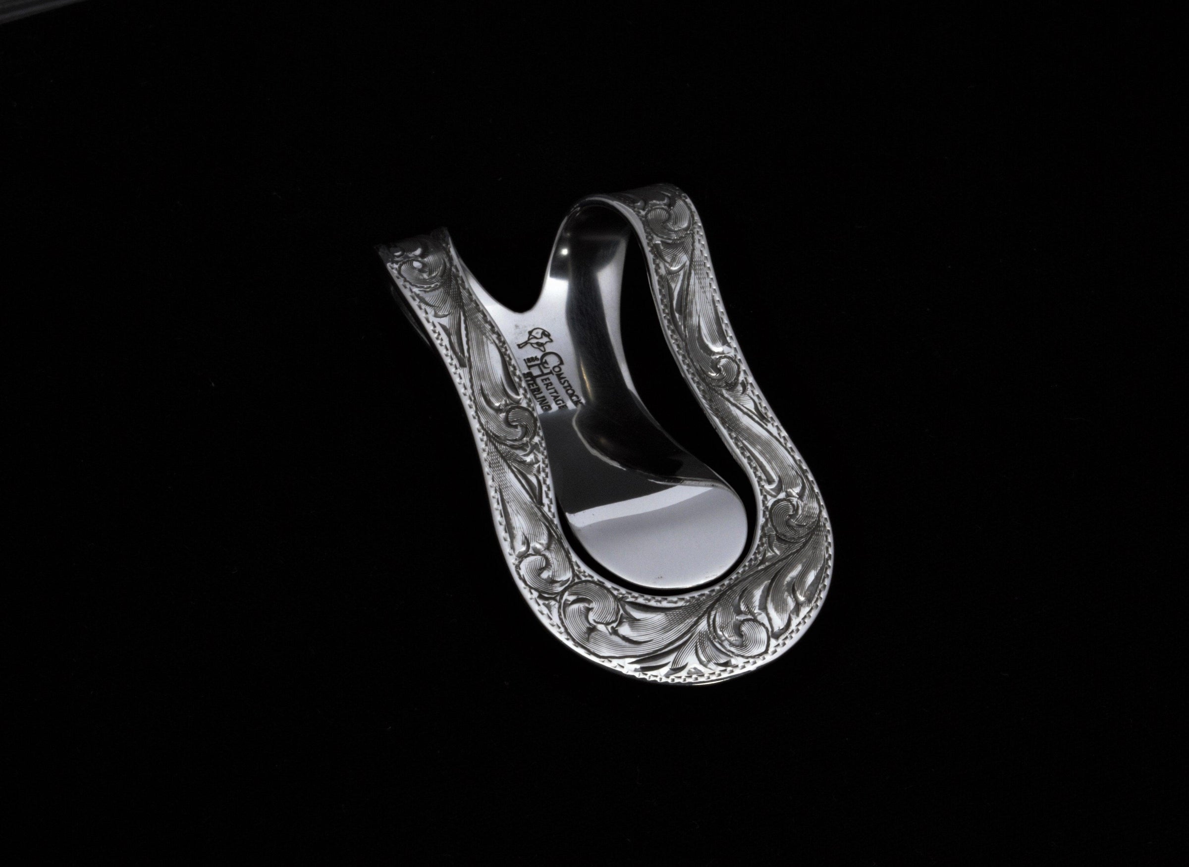 The Big Bend Victorian Engraved Money Clip by Comstock Heritage is a heavy gauge Sterling Silver money clip featuring hand cut floral engraving surrounded by a small hand engraved border. The bottom border has a small ribbon that would make a great platform for a custom inscription or initials. (Last photo is hand written inscription example)
