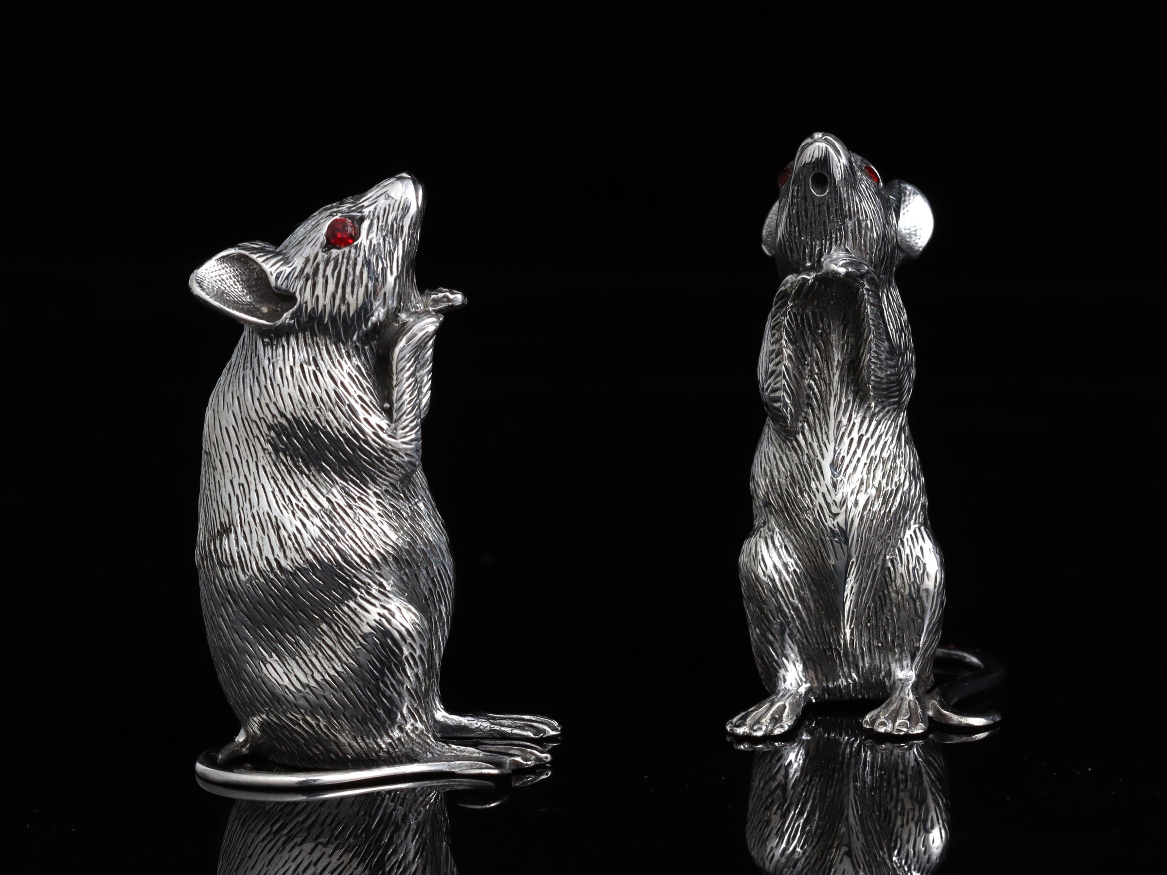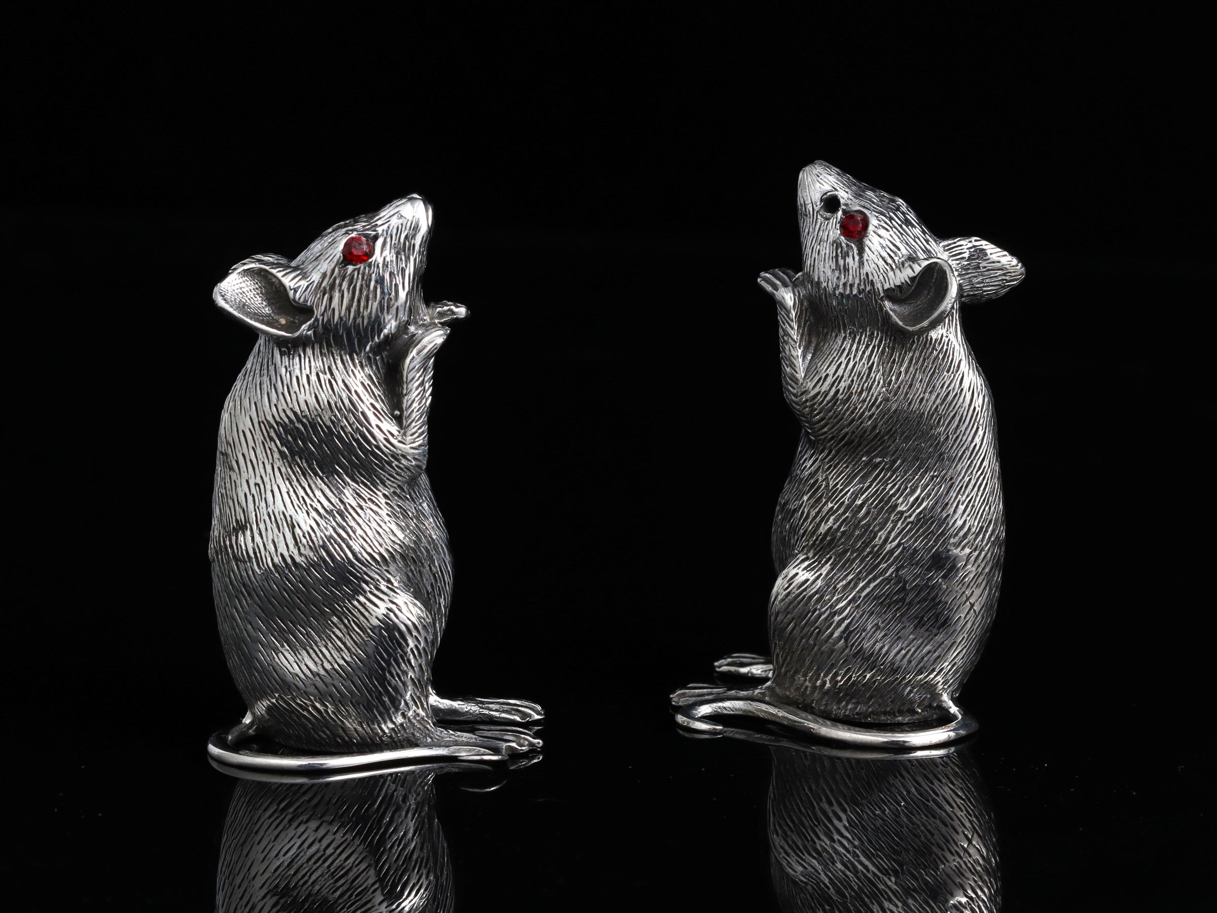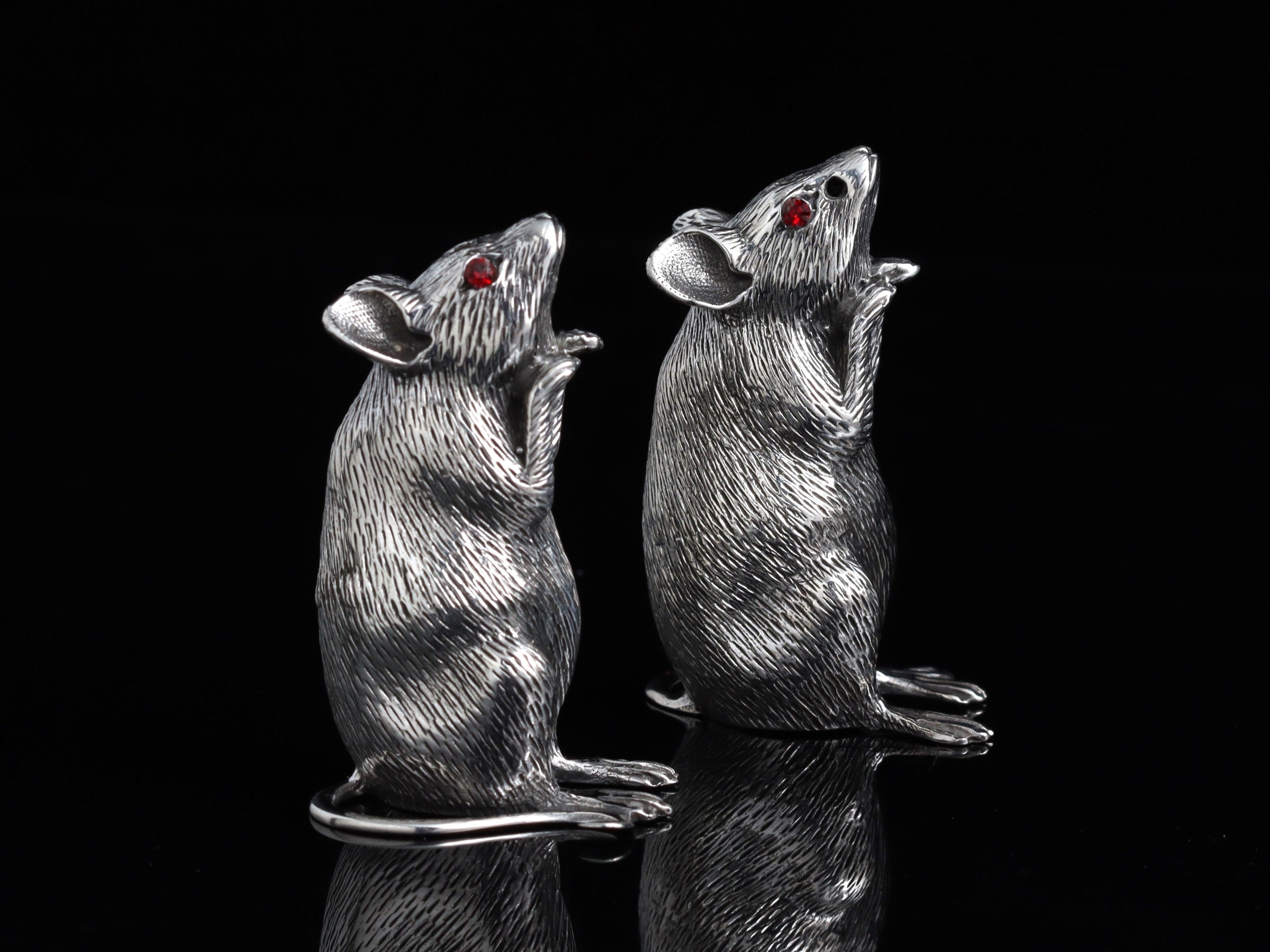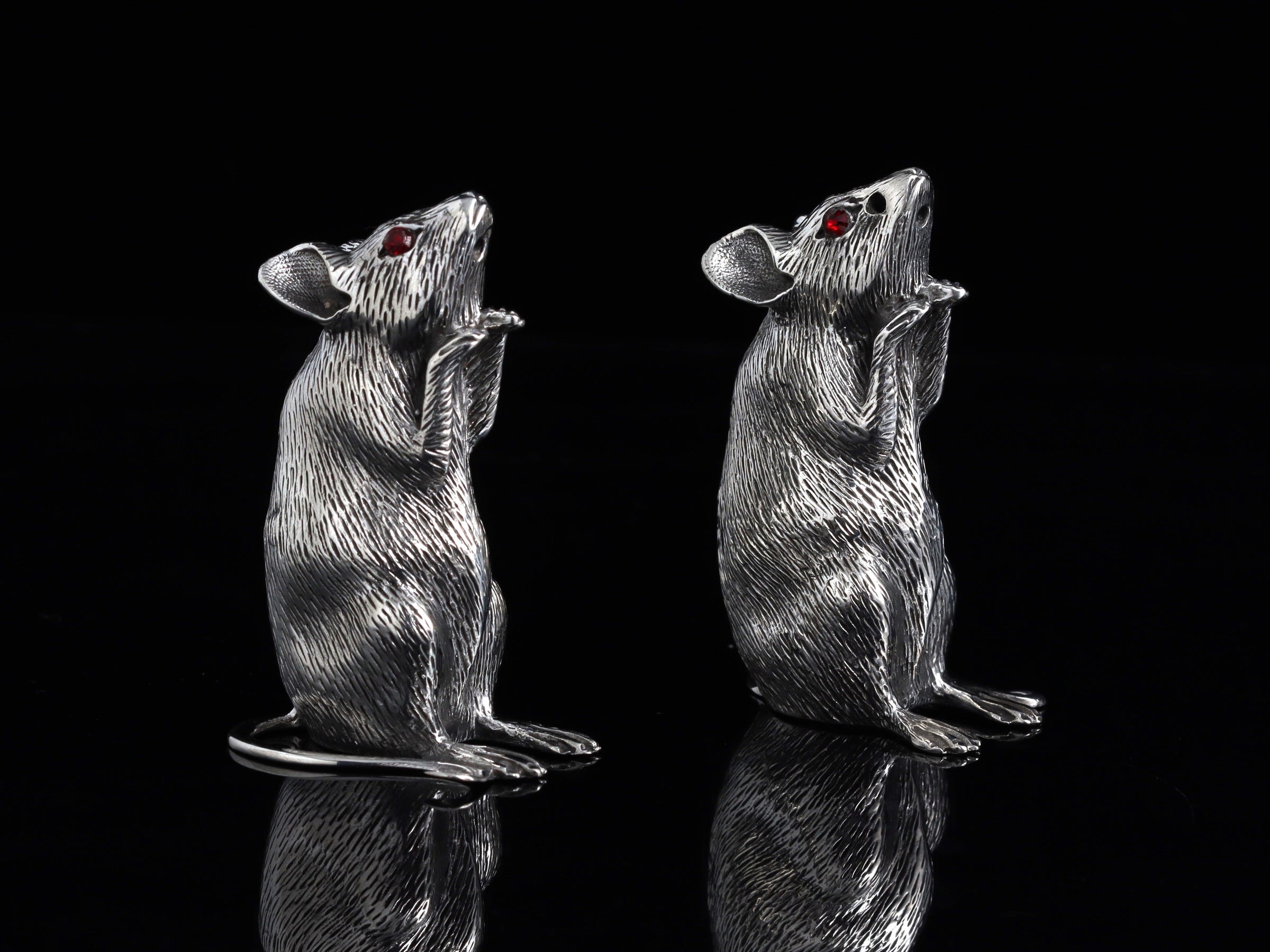 These fabulous hallmarked 2" tall Sterling silver mice salt and pepper shakers by Francis Howard are guaranteed to be a talking point at the dinner table! These amazing little pieces are handmade with exquisite fur detailing and feature stunning red stone eyes. A silver screw is fitted into the base of each piece to allow them to be filled and emptied.