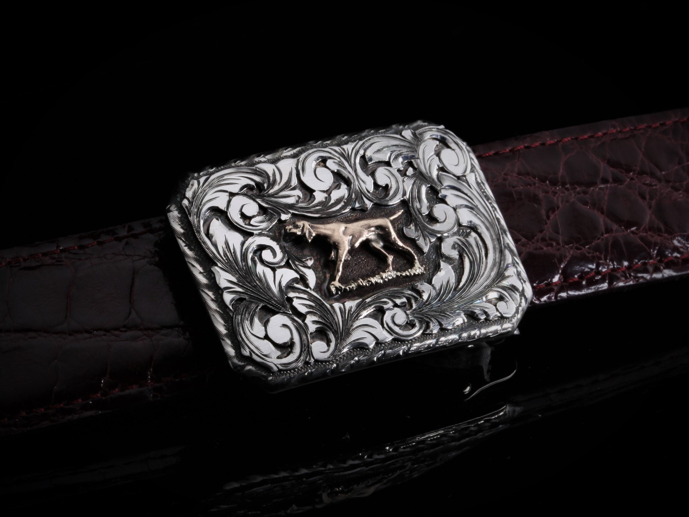The Executive Dog by Comstock Heritage is a 1 ¼" Sterling silver "Charlie" style clipped corner buckle featuring hand cut Sterling silver scroll overlays around a hand cast 14k yellow gold hunting dog. This piece is then framed by a hand engraved border.