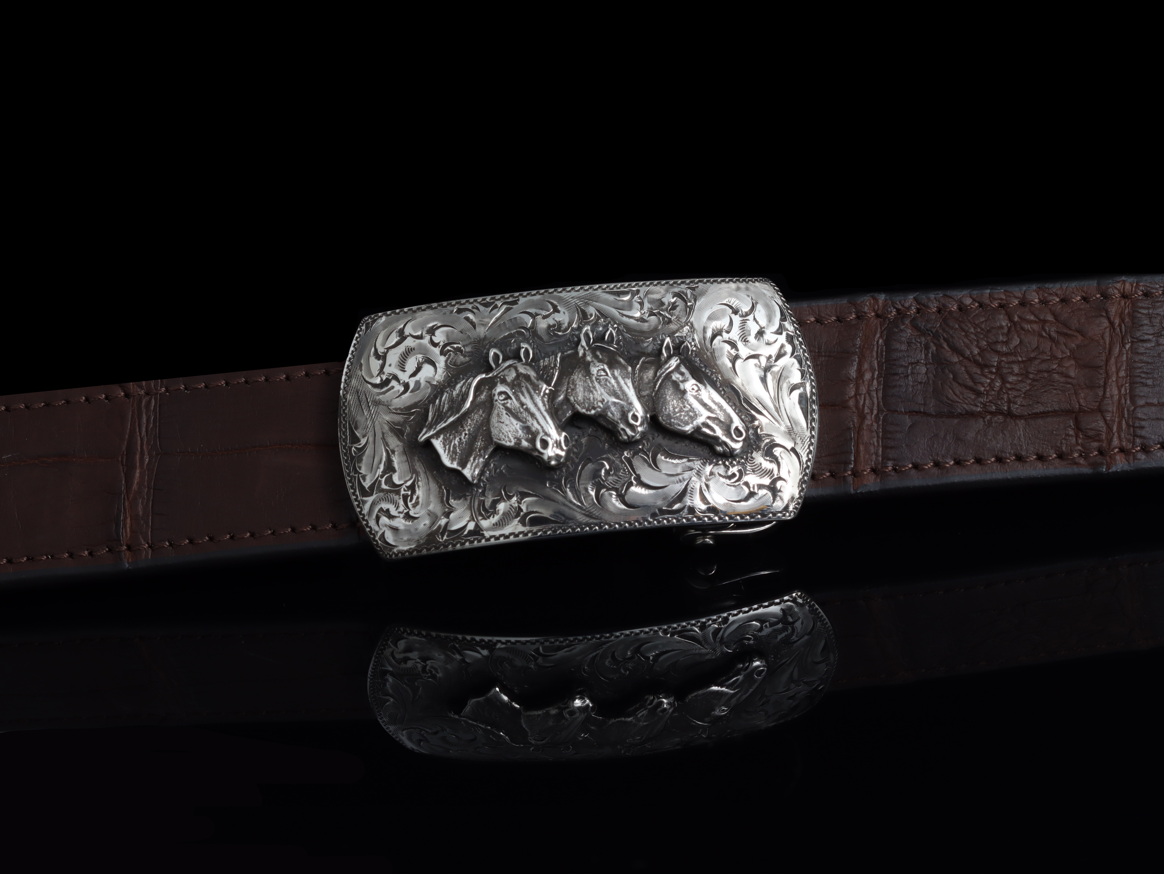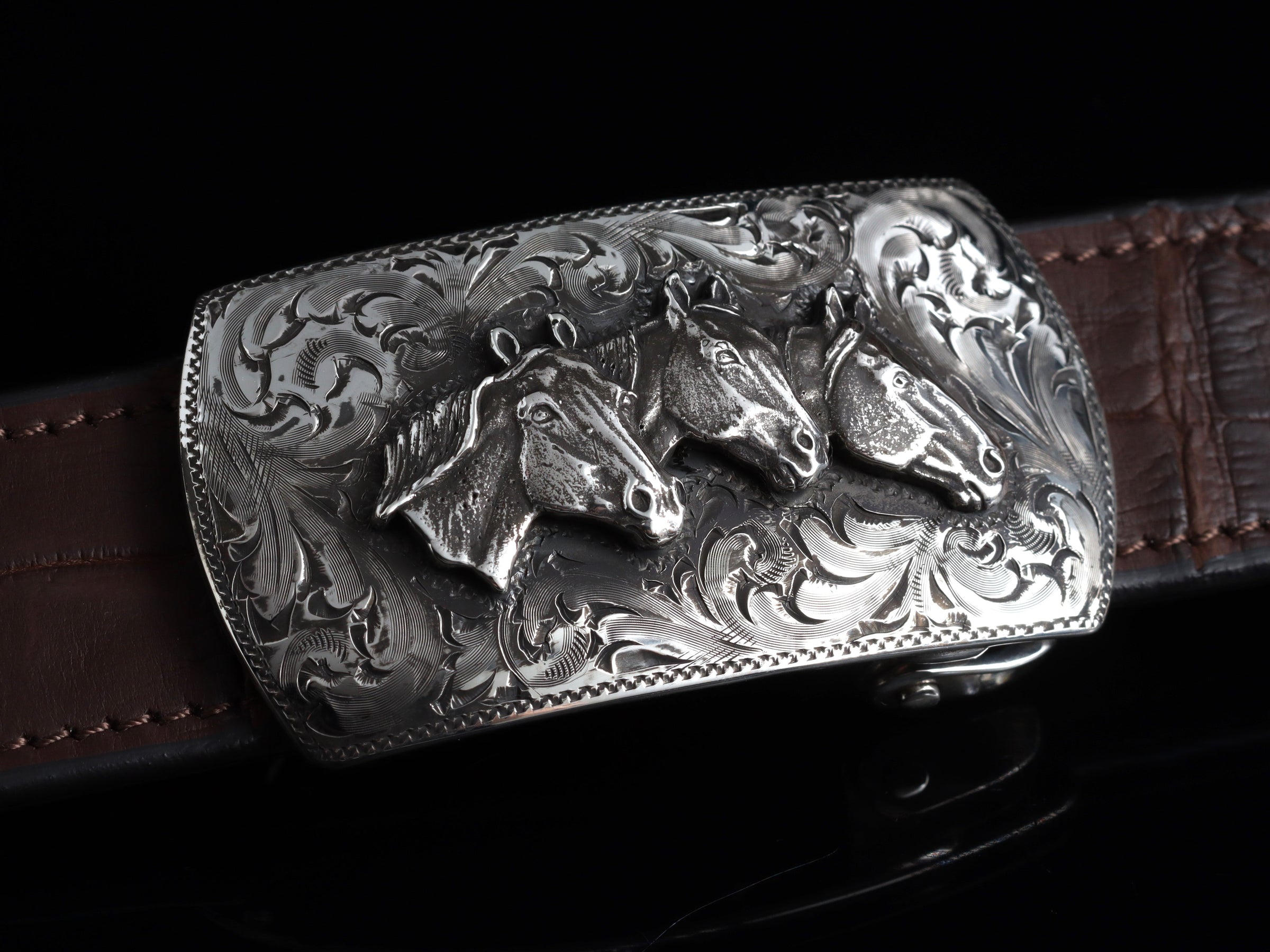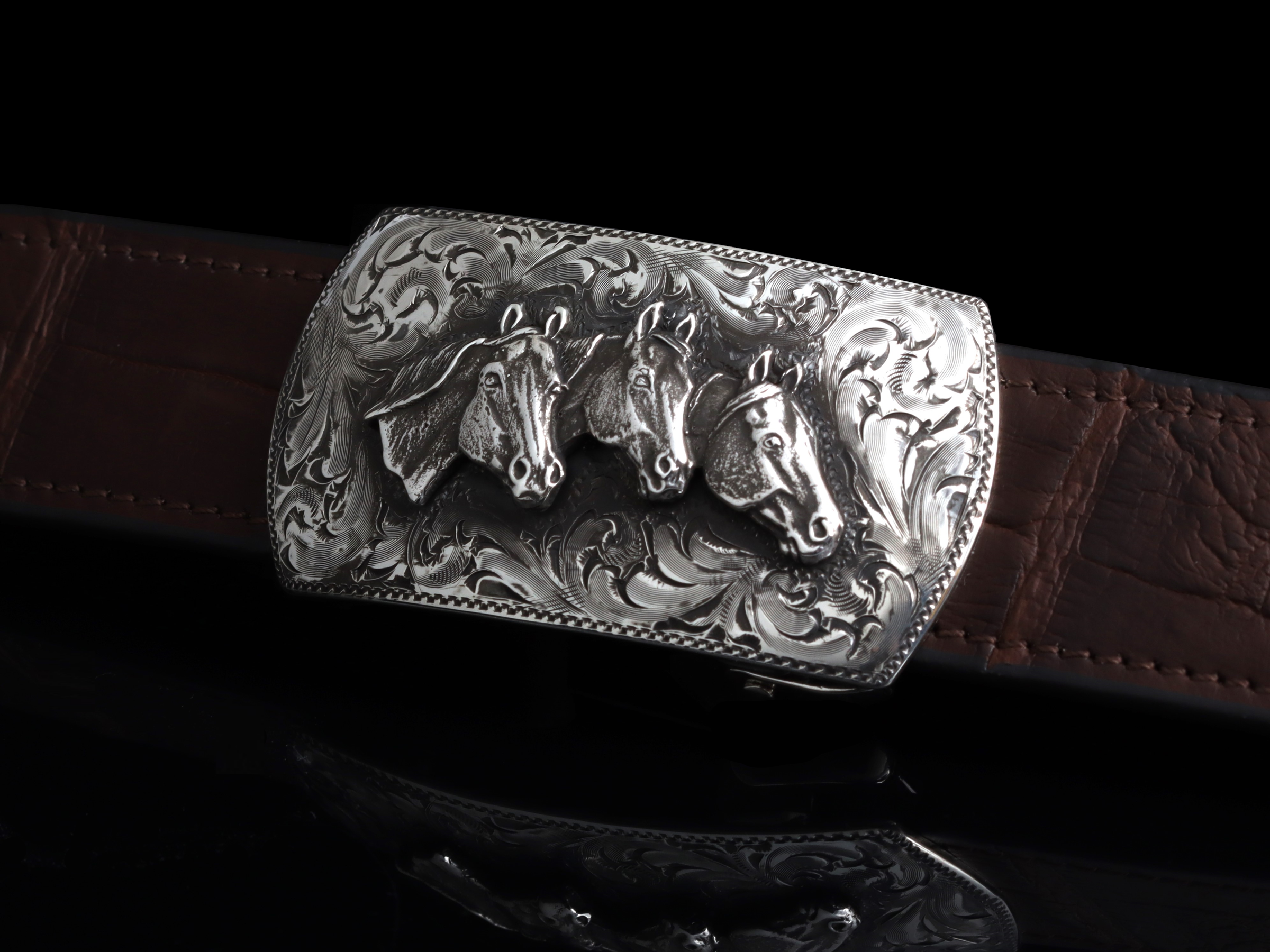 The P50 Horse Head Trio by Comstock Heritage is a Sterling silver rectangular buckle featuring hand engraving around a hand cast Sterling silver trio of horse heads.