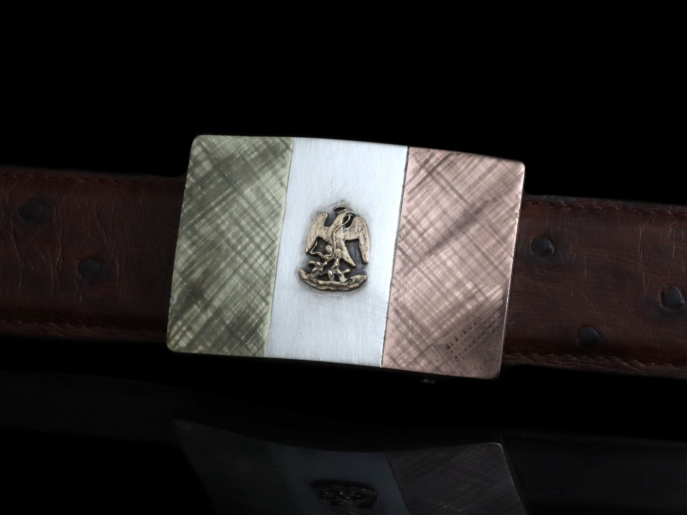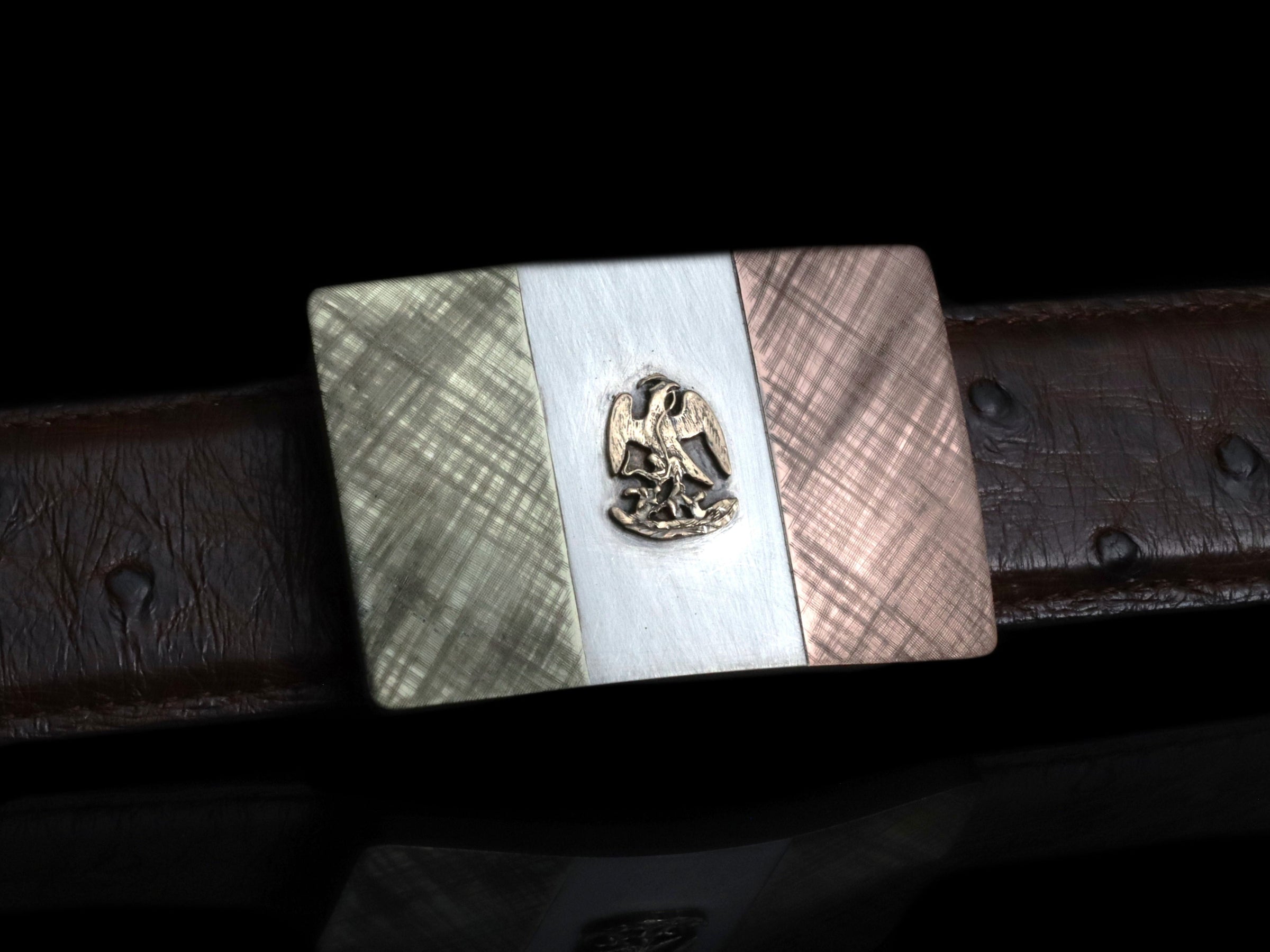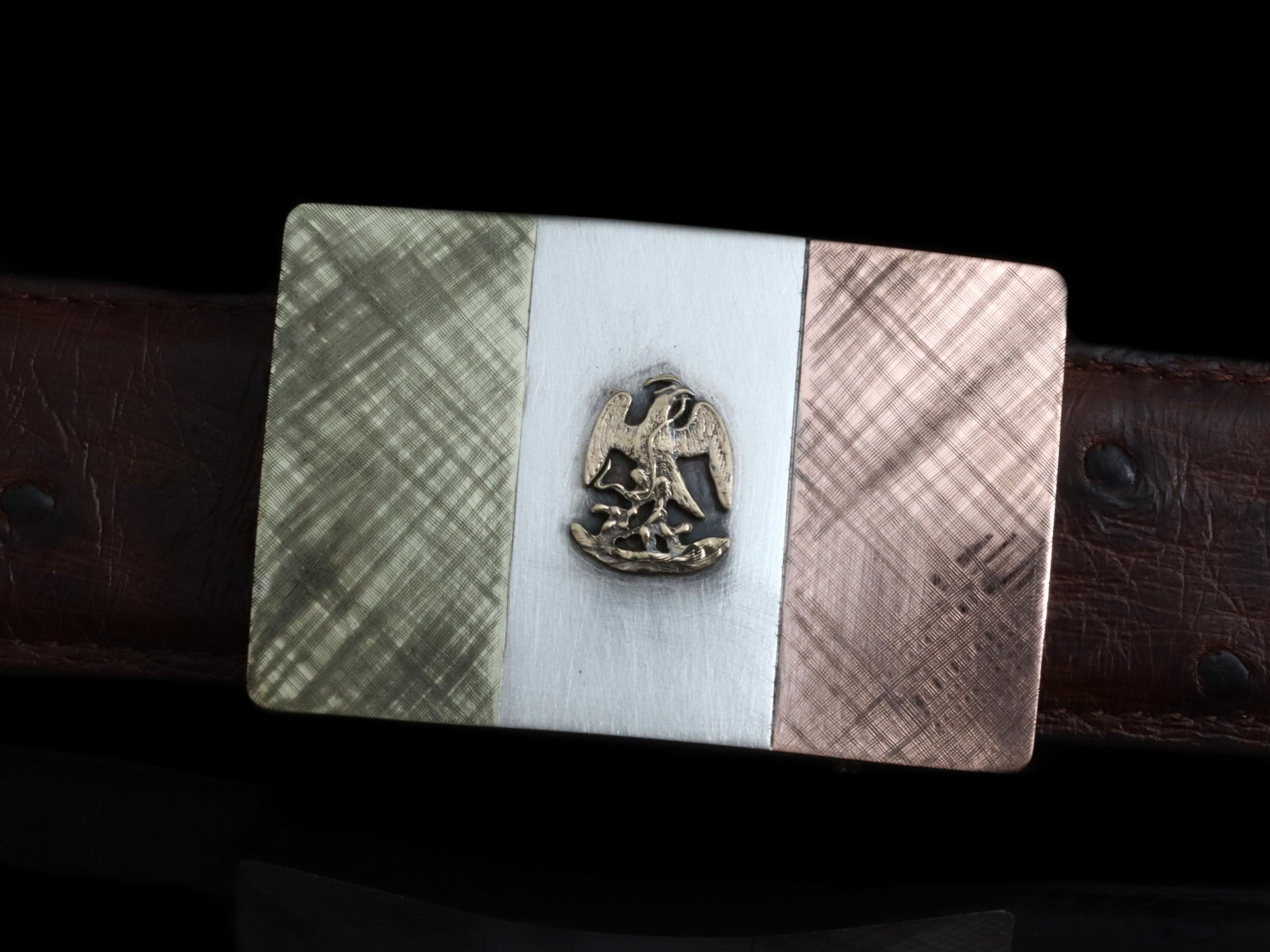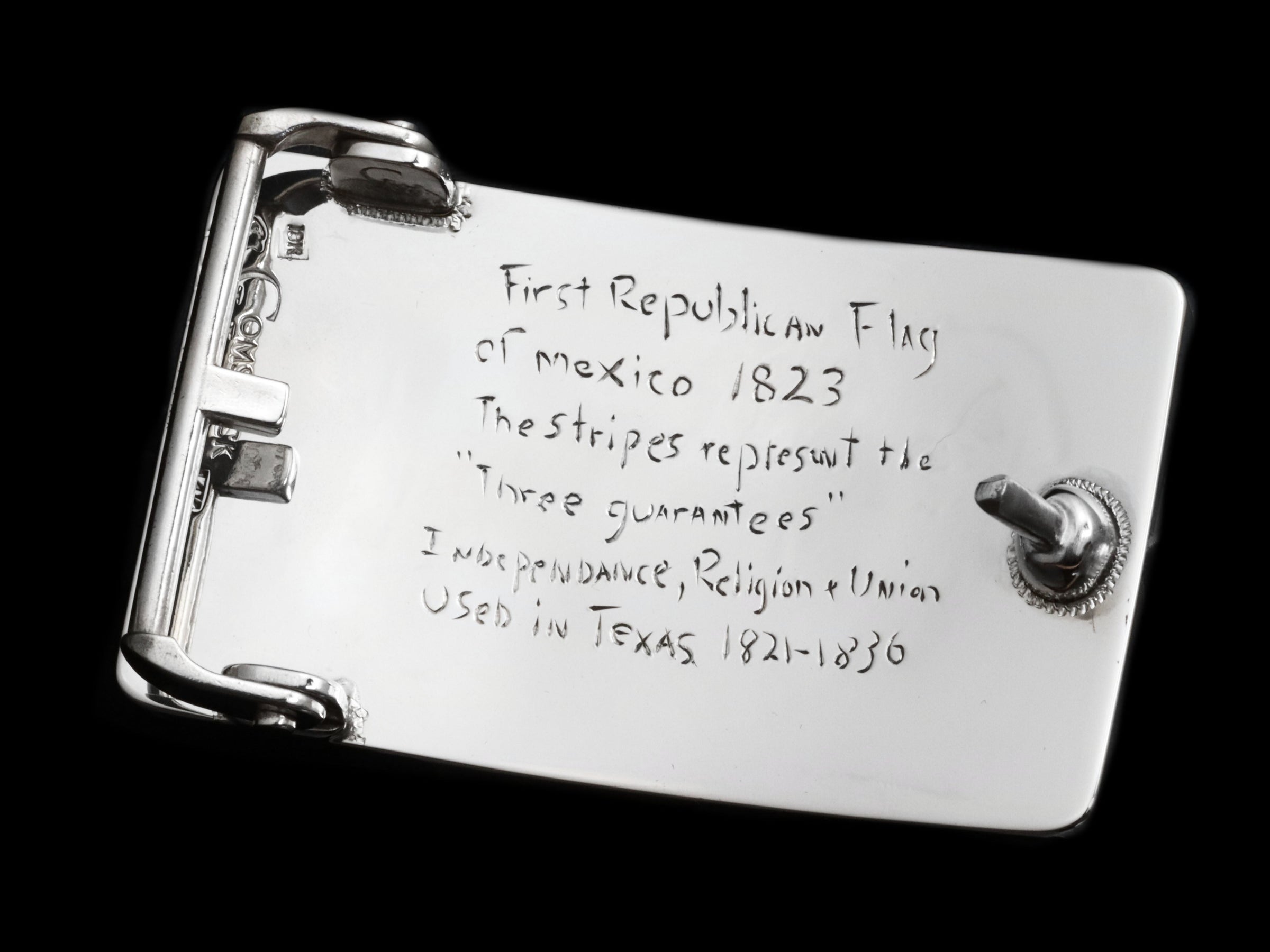 The Mason Six Flags of Texas - Eagle by Comstock Heritage is a Sterling silver "Mason" buckle featuring a Vintage Flag in 14k Rose, Yellow and Green golds. The center Sterling silver stripe features a 14k yellow gold eagle, flanked by 18k green gold and 14k rose gold panels that have been Florentine engraved.