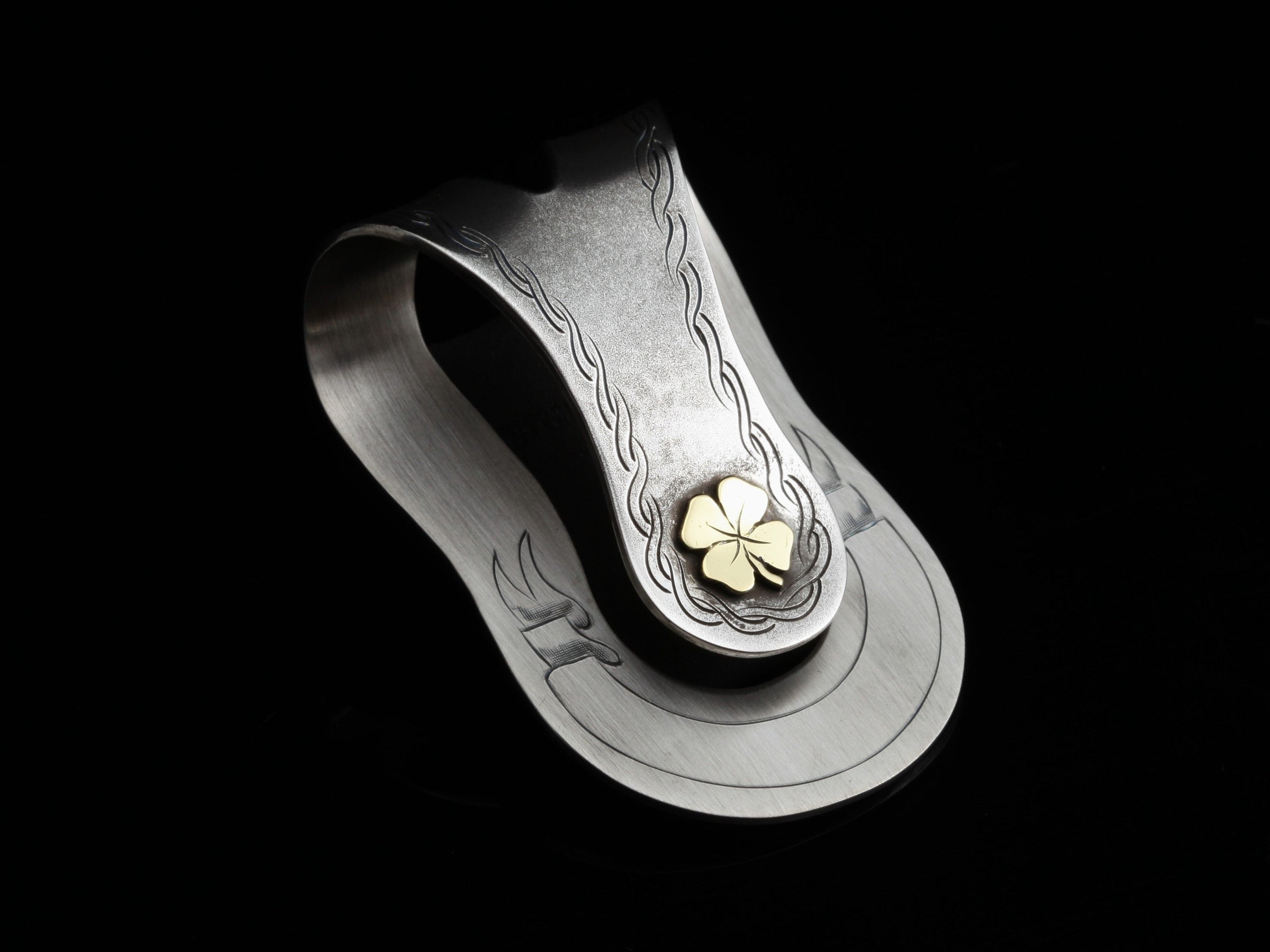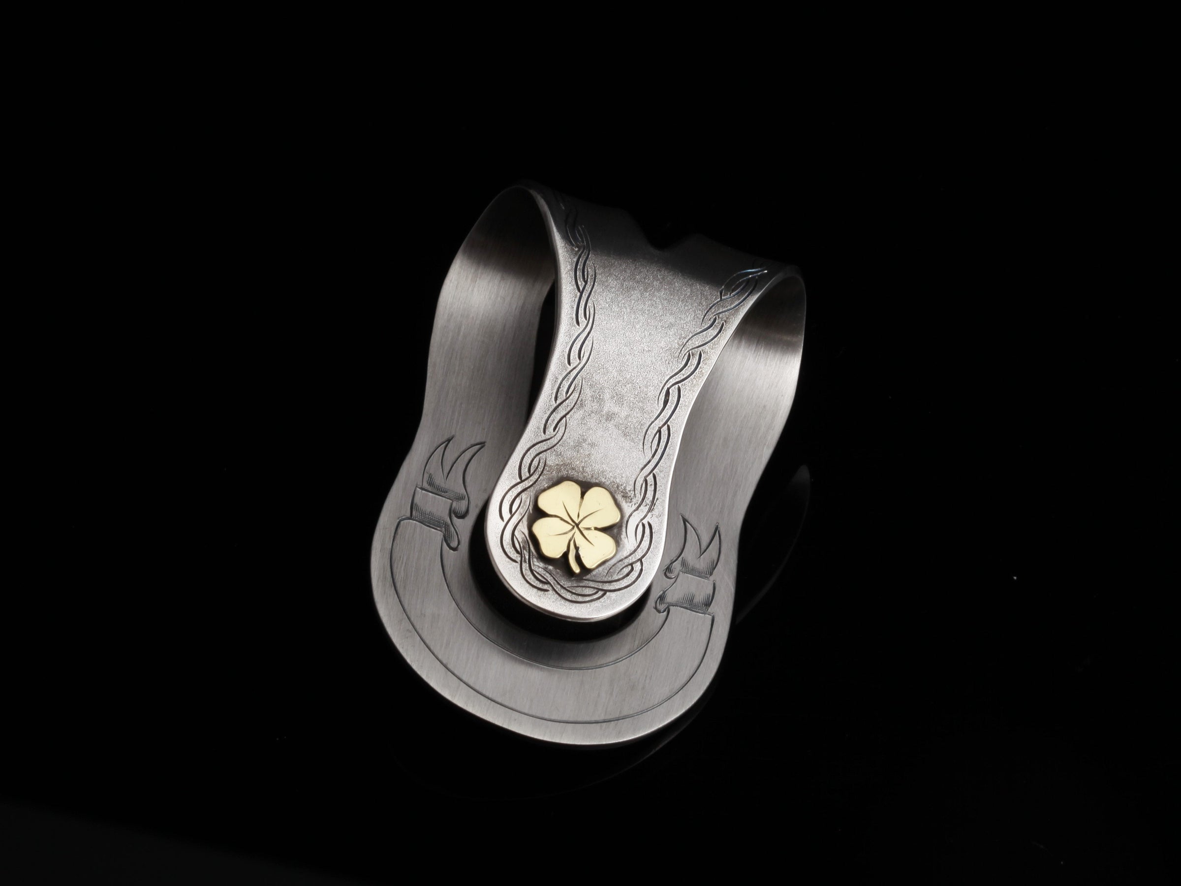 A twist on a classic Comstock Heritage money clip, the 4 Leaf Clover Money Clip 18K has been upgraded. On top of a Sterling Silver hand formed base, we have overlaid an 18K green gold 4 leaf clover inside a Celtic border. This piece is then given a pebbled finish, the result is a design that is simple and playful, yet elegant. The bottom border has a small ribbon that would make a great platform for a custom inscription or initials. (Last photo is hand written inscription example)
