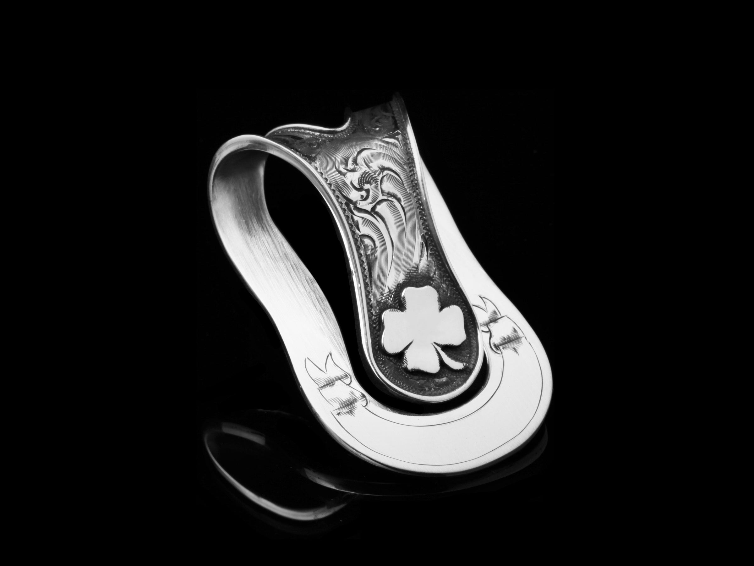 The Big Bend 4 Leaf Clover Engraved Money Clip With Wire by Comstock Heritage is a Sterling Silver heavy gauge wide bend money clip with cut out center and hand cut Sterling Silver 4 leaf clover overlay. The whole center scene is then framed by a meticulously hand formed Sterling Silver wire. This money clip is wide enough to guard your money and wish you luck. The bottom border has a small ribbon that would make a great platform for a custom inscription or initials. (Last photo is hand written inscription example)