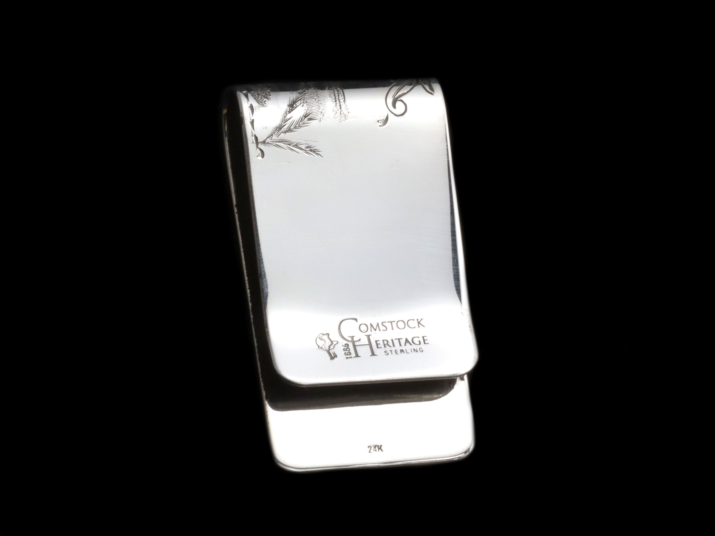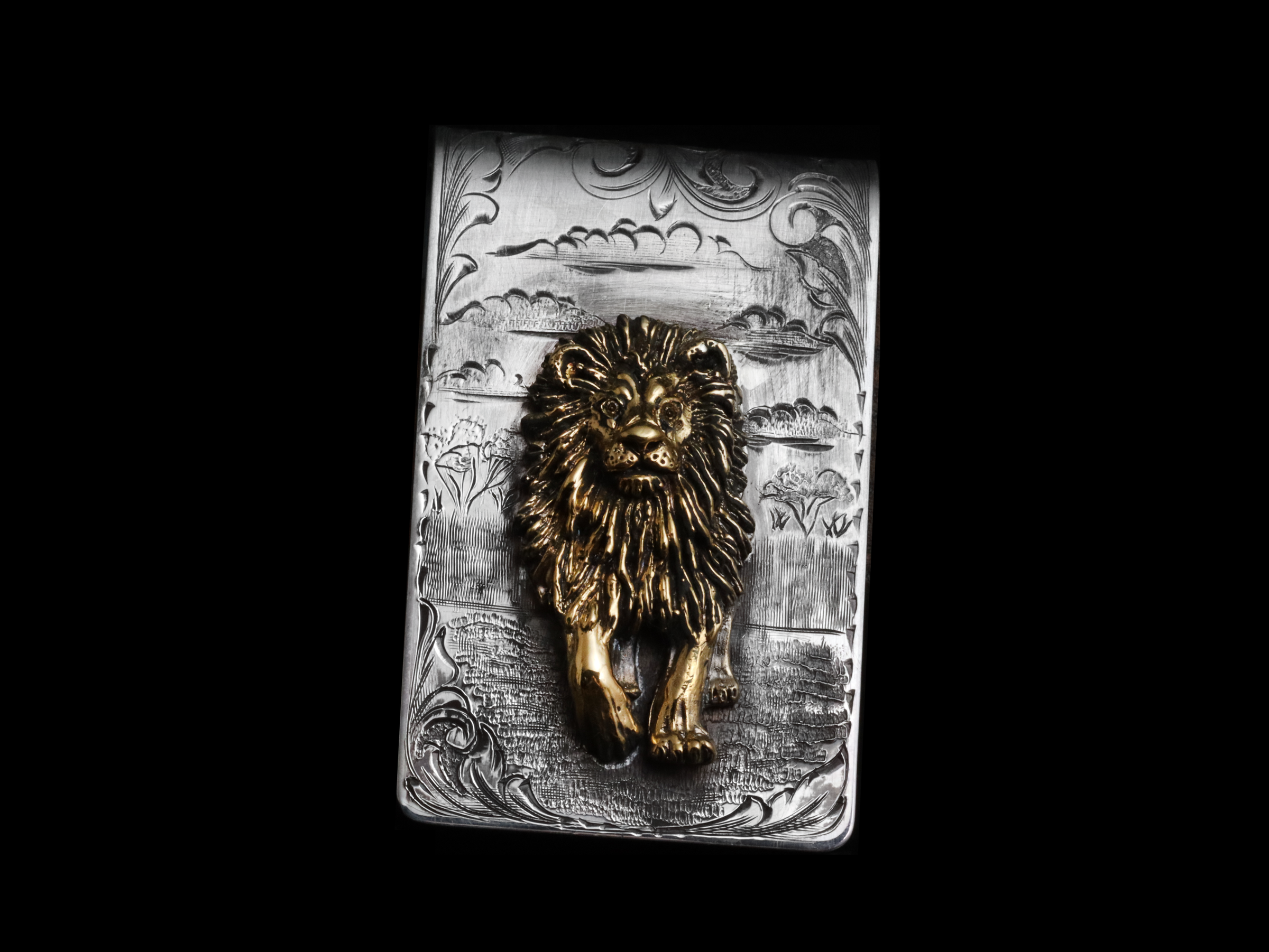 The 24k Gold Lion Money Clip by Comstock Heritage is a Sterling silver piece featuring an African beauty. Hand engraved with careful detail, it offers a relaxed yet intricate look that feels effortless. Among the hand engraved African scenery, is a solid 24k yellow gold lion with cognac diamond eyes set among he trees.