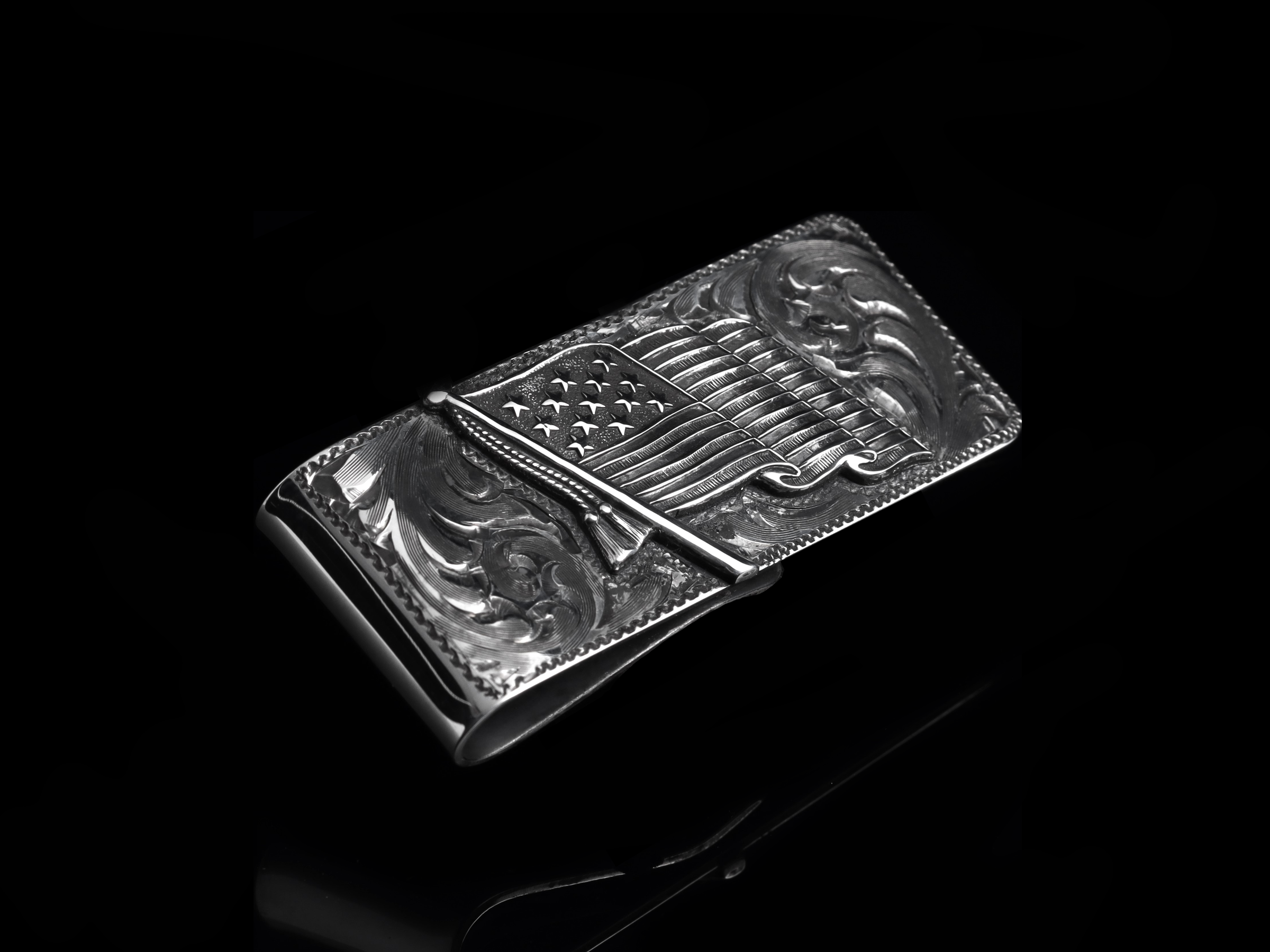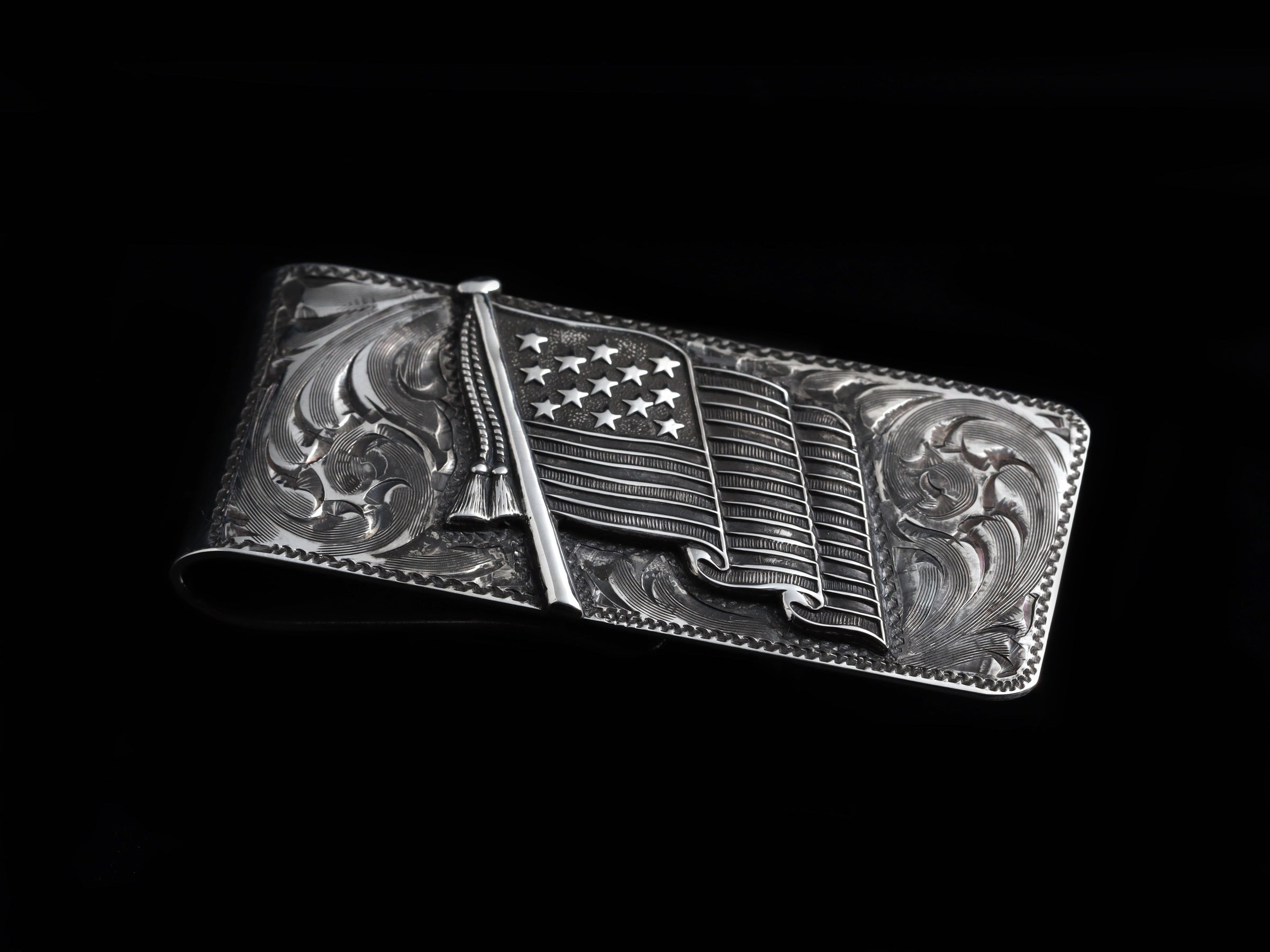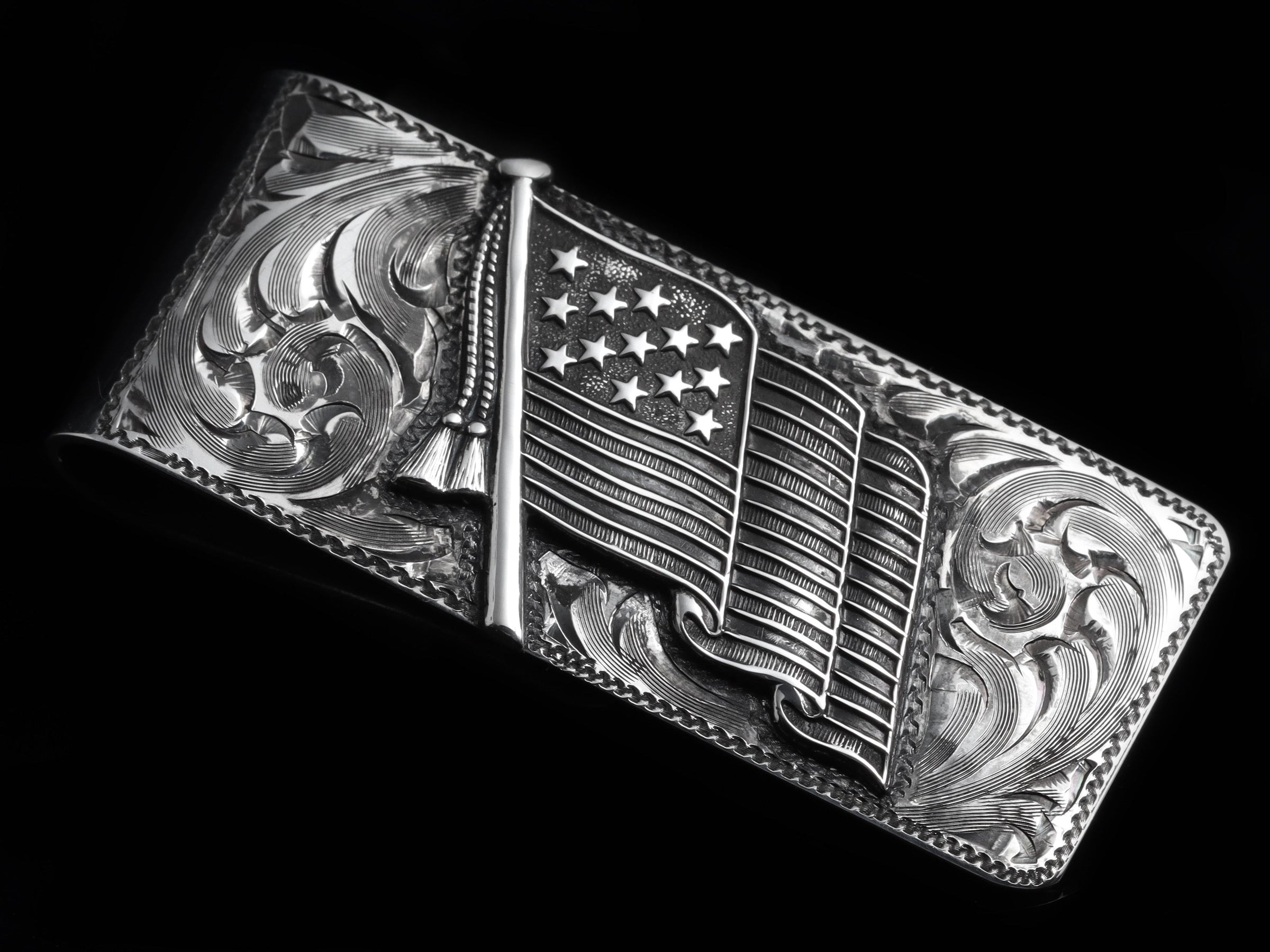 The American Flag Money Clip by Comstock Heritage features our great homage to our country, backgrounded by hand-engraved detailing. A hand sawn, Sterling Silver, American Flag has been set on top of our classic scroll engraving and then oxidized for depth and contrast. Handmade in the USA out of heavy gauge sterling silver. Smooth back. (Last photo is hand written inscription example)