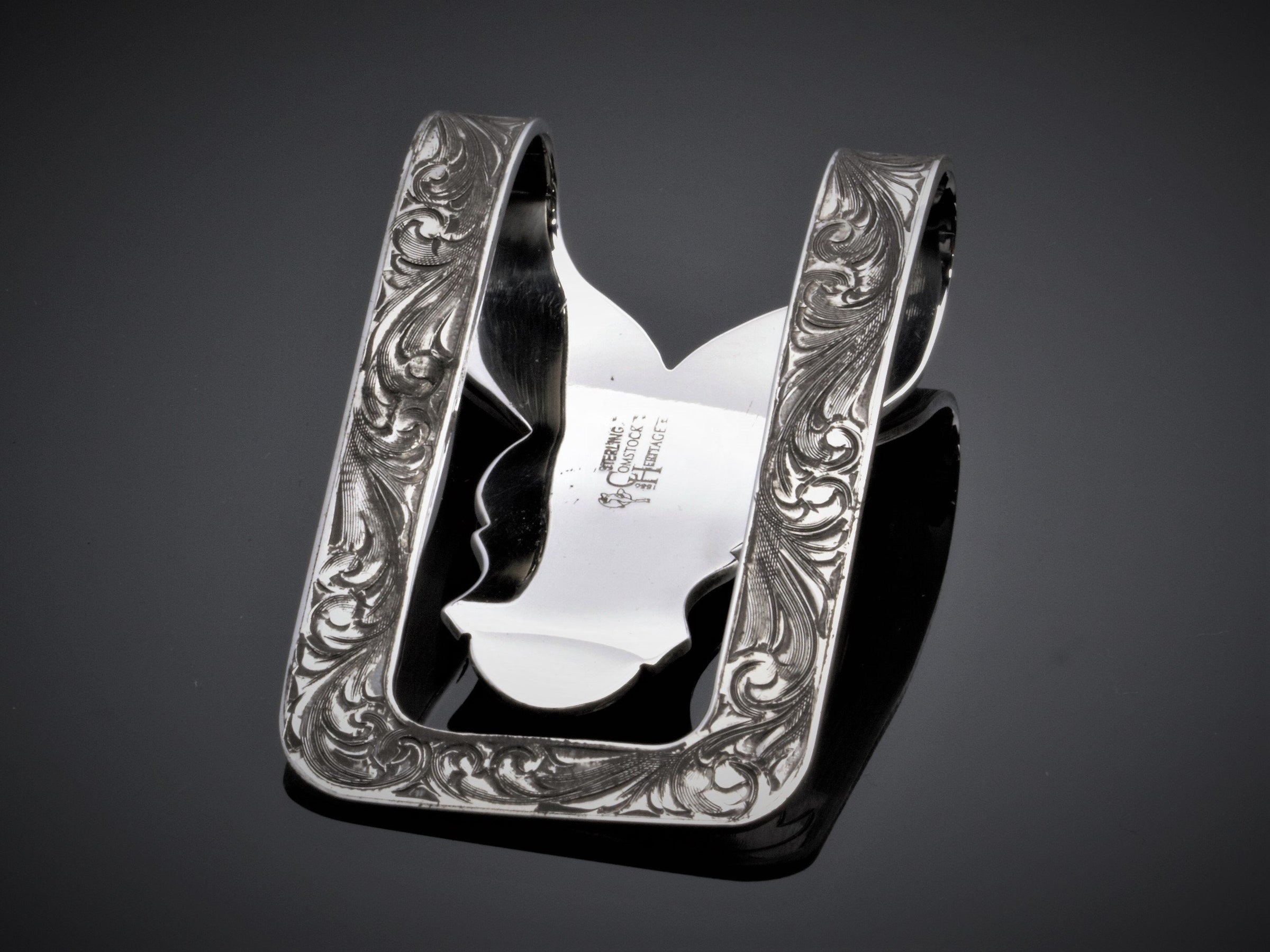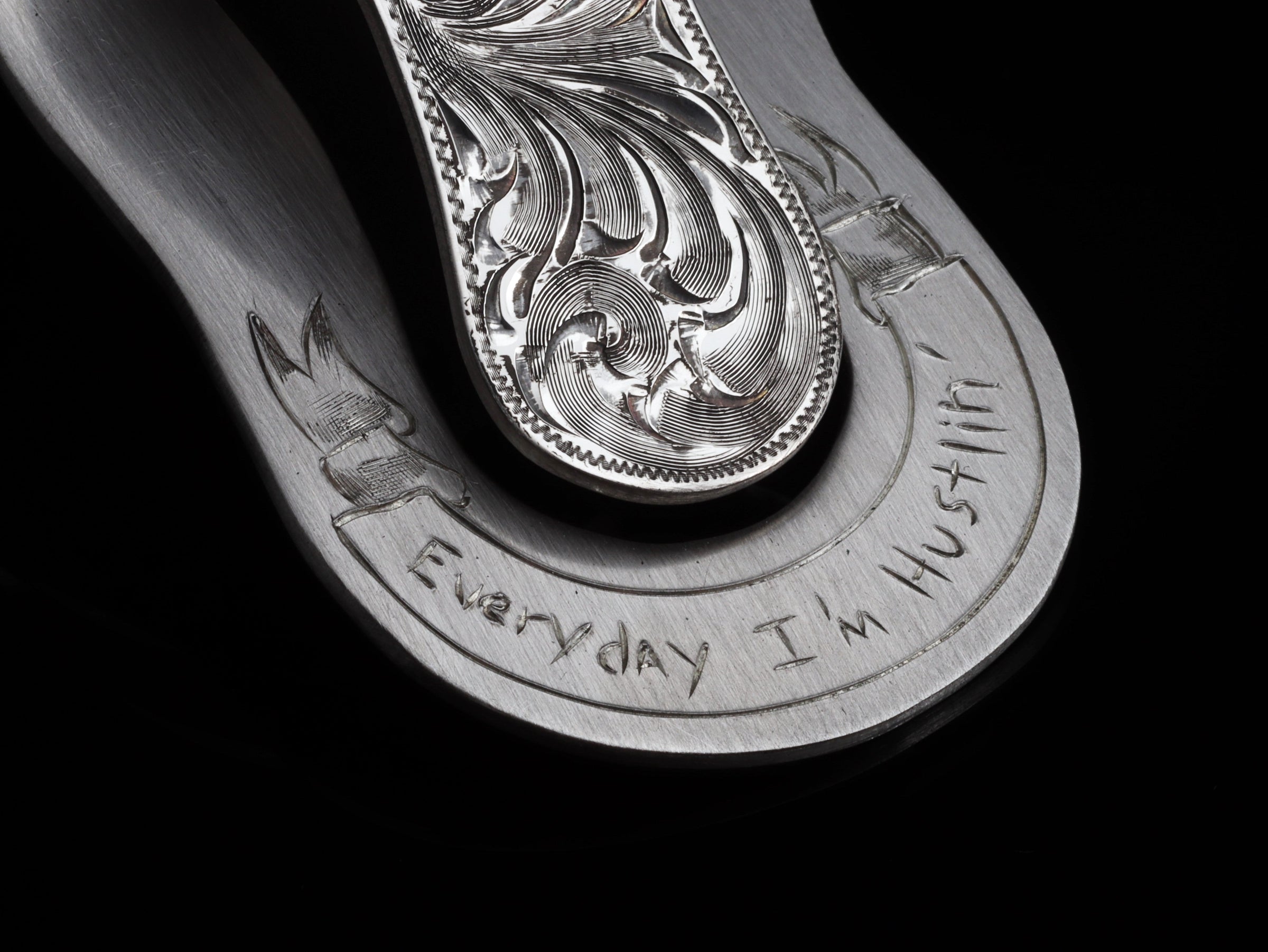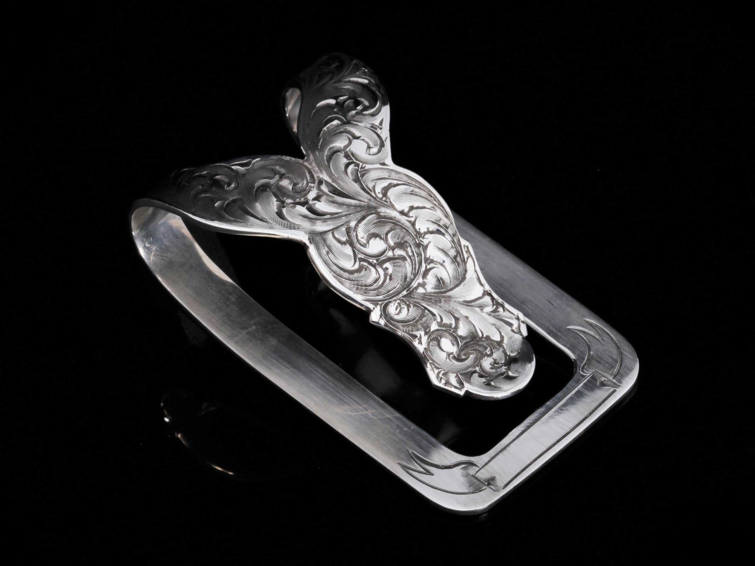 The VM Scroll Money Clip by Comstock Heritage is a heavy gauge point and scallop shape Sterling silver money clip featuring hand cut scroll style engraving surrounded by a small hand engraved border. The bottom border has a small ribbon that would make a great platform for a custom inscription or initials. (Last photo is hand written inscription example)