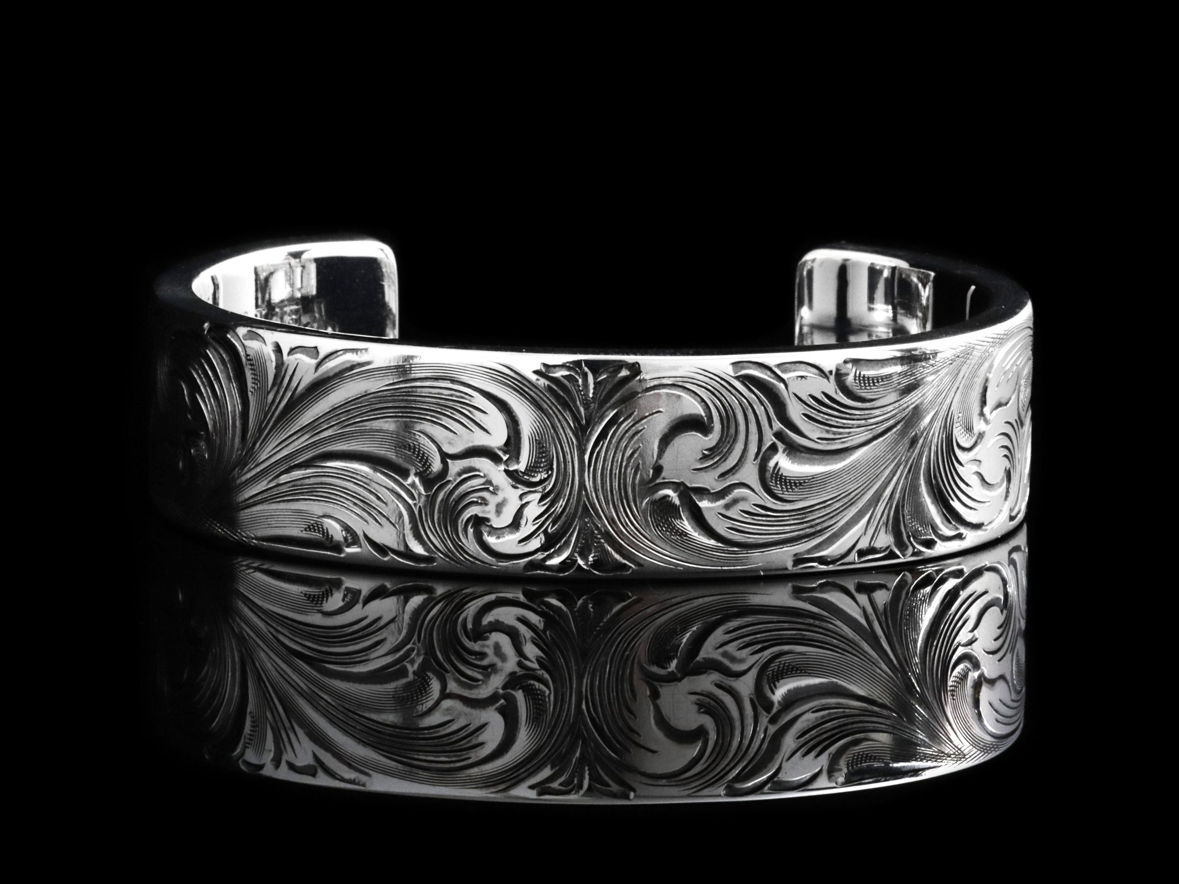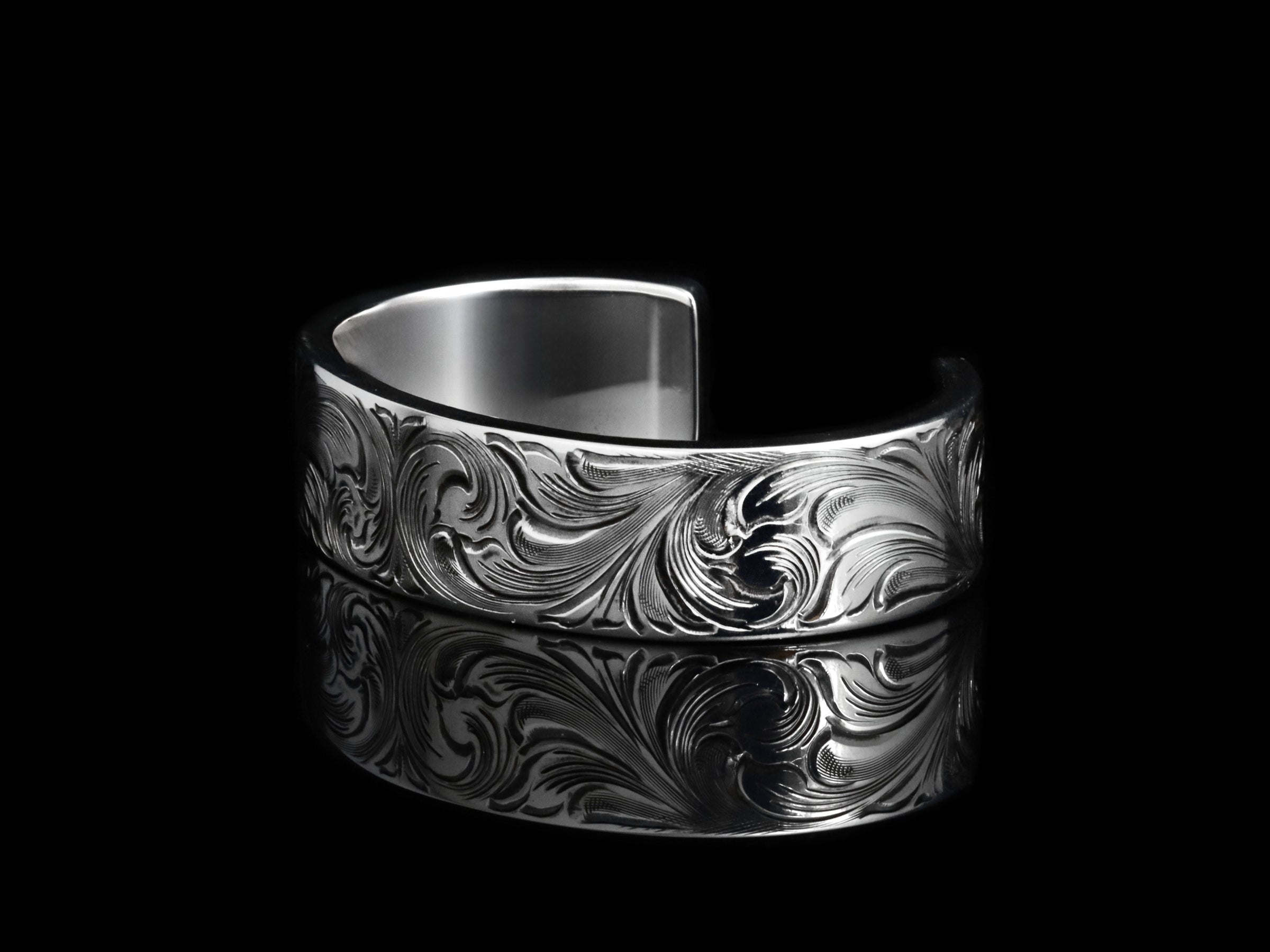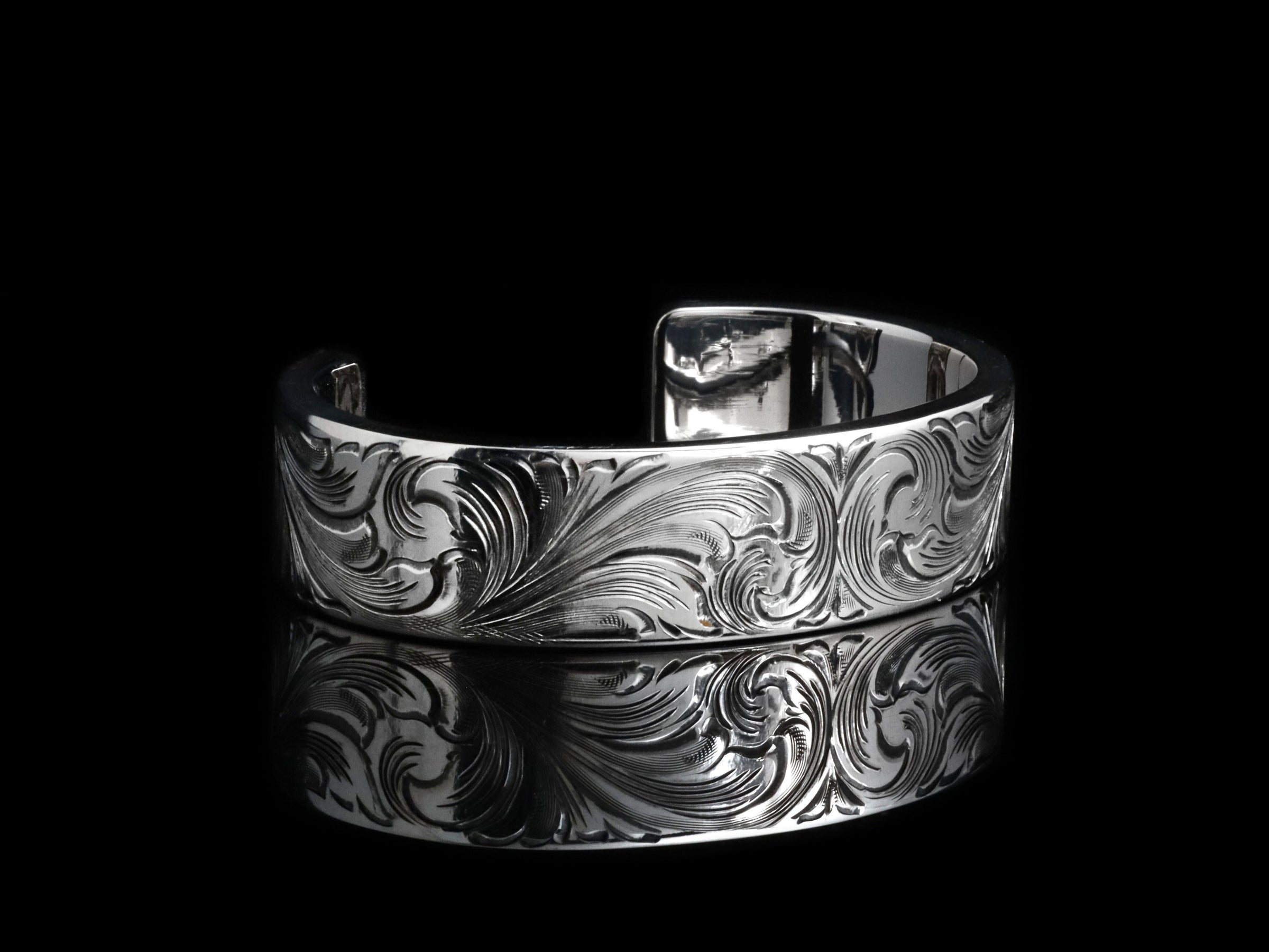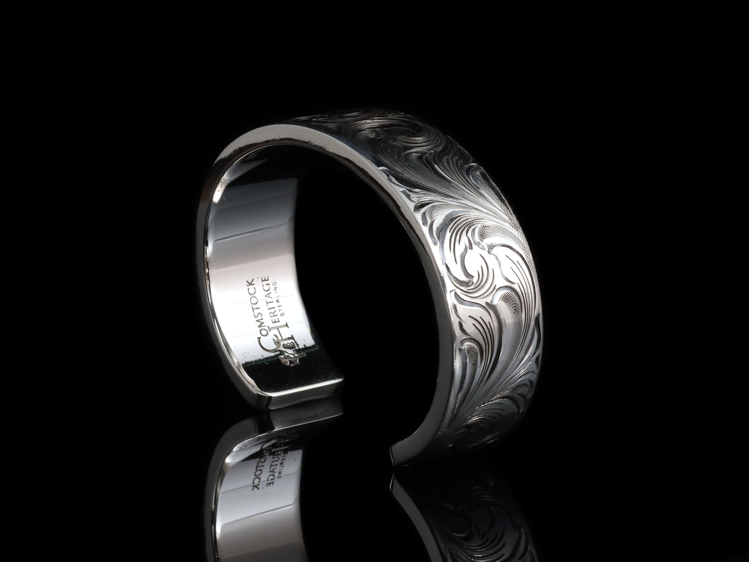 The Single Point Cuff by Comstock Heritage is a ¾” wide, heavy-gauge sterling silver cuff showcasing exceptional hand engraved detail. This "single point" engraving style is slightly more specialized than the classic scroll engraving on our other pieces. Extra attention has been given to the symmetry and fluidity of this piece.