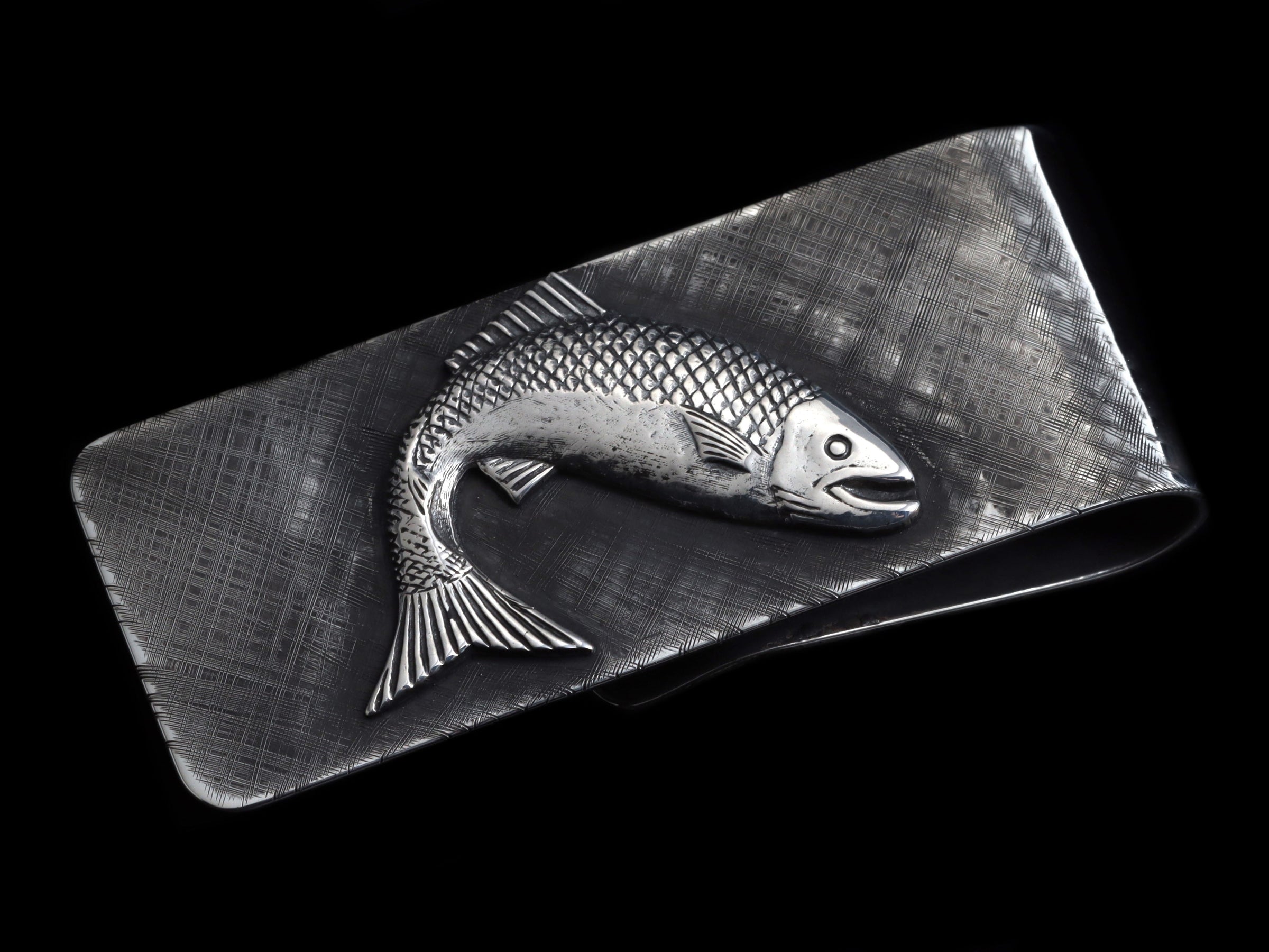 The Fish & Florentine Money Clip is a hand engraved, Sterling silver money clip featuring a hand stamped Sterling silver fish in the center and Florentine hand engraving through out. Measures approx. 2 1/4" x 1". (Last photo is an example of the hand written inscription)