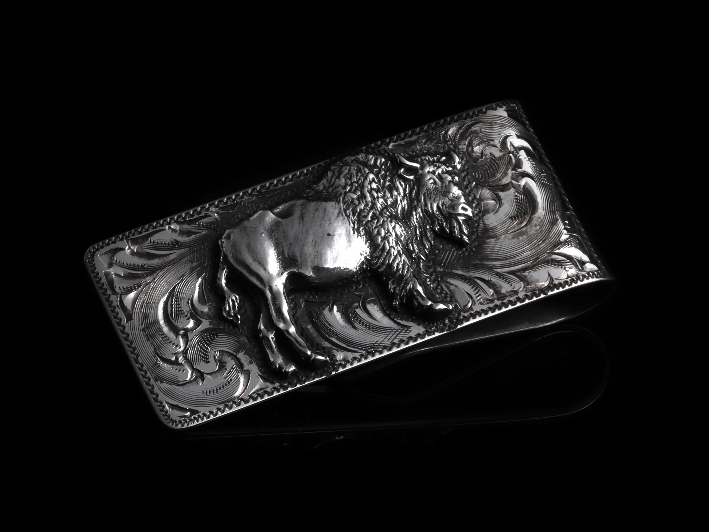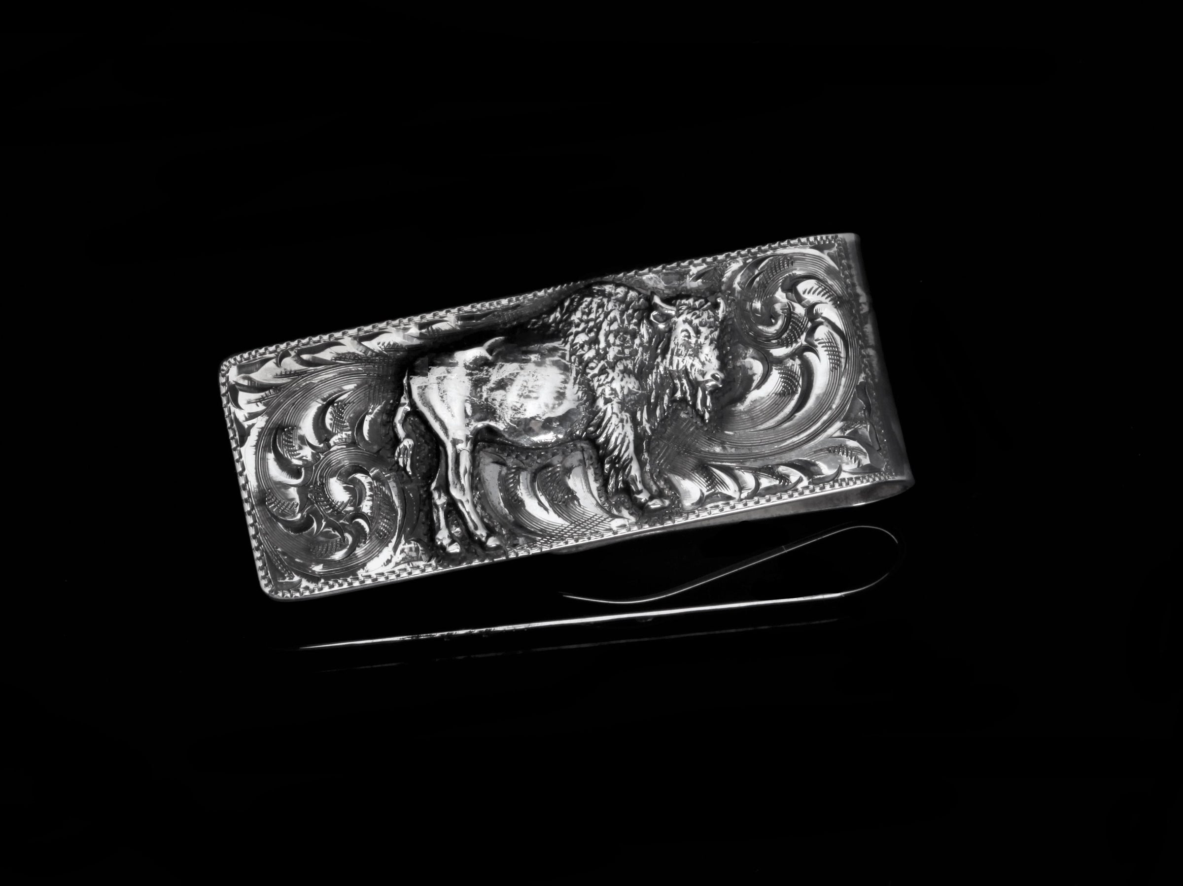 The Buffalo Money Clip by Comstock Heritage is a Sterling Silver money clip, featuring a hand cast Sterling Silver Buffalo in the center and hand engraving throughout. (Last photo is hand written inscription example)