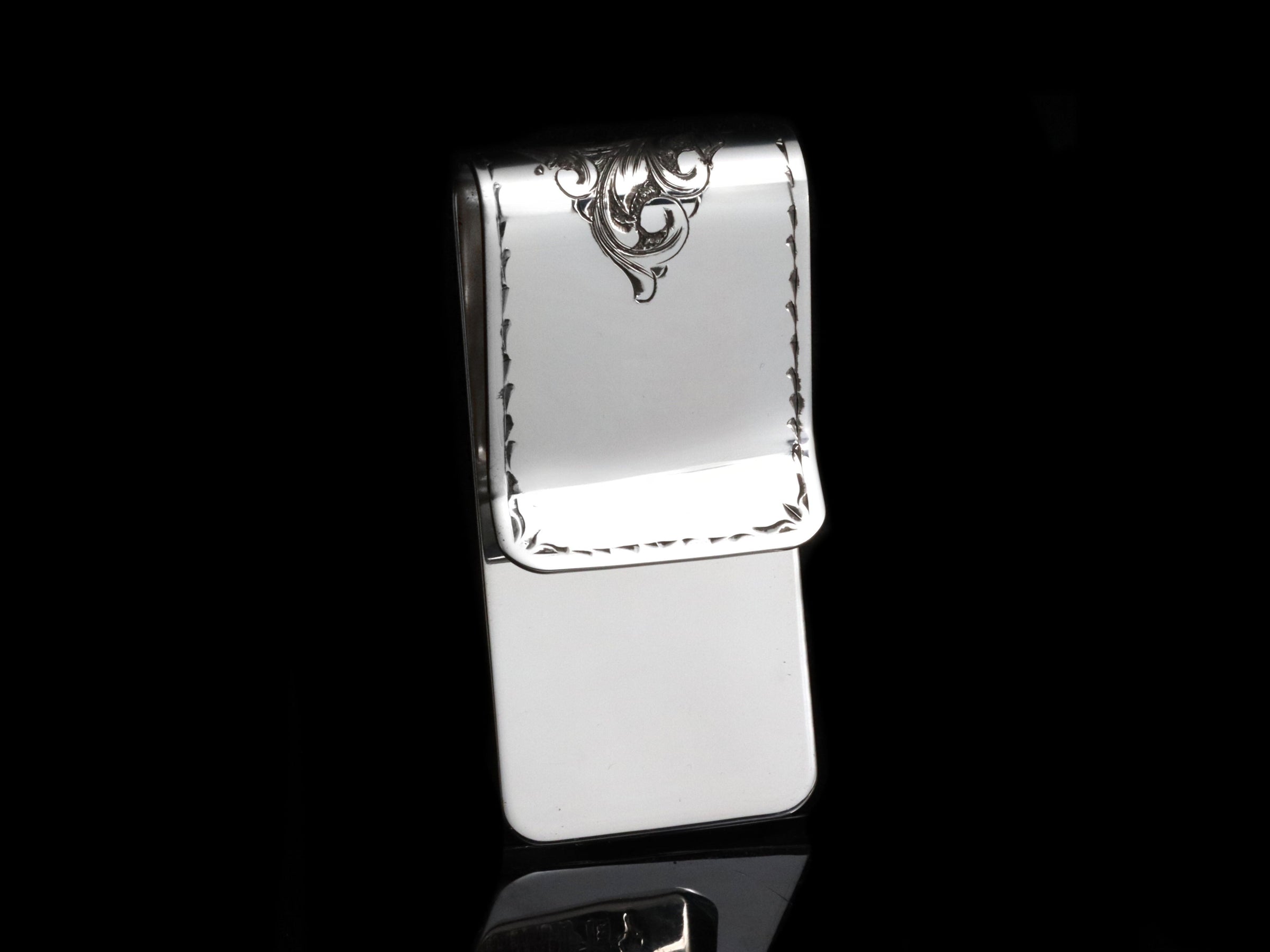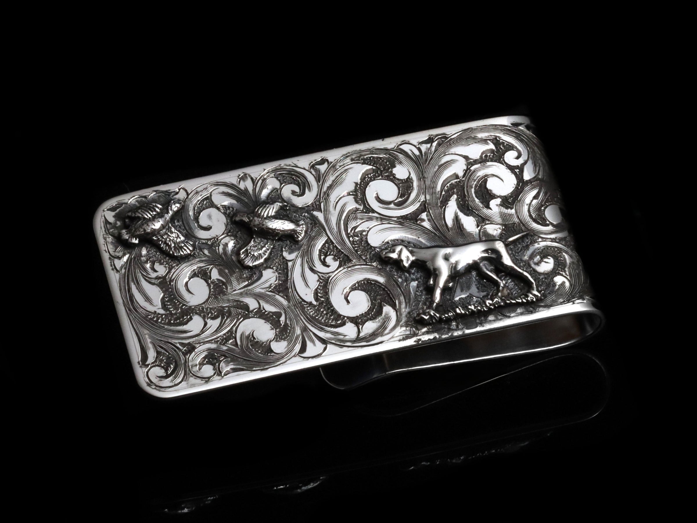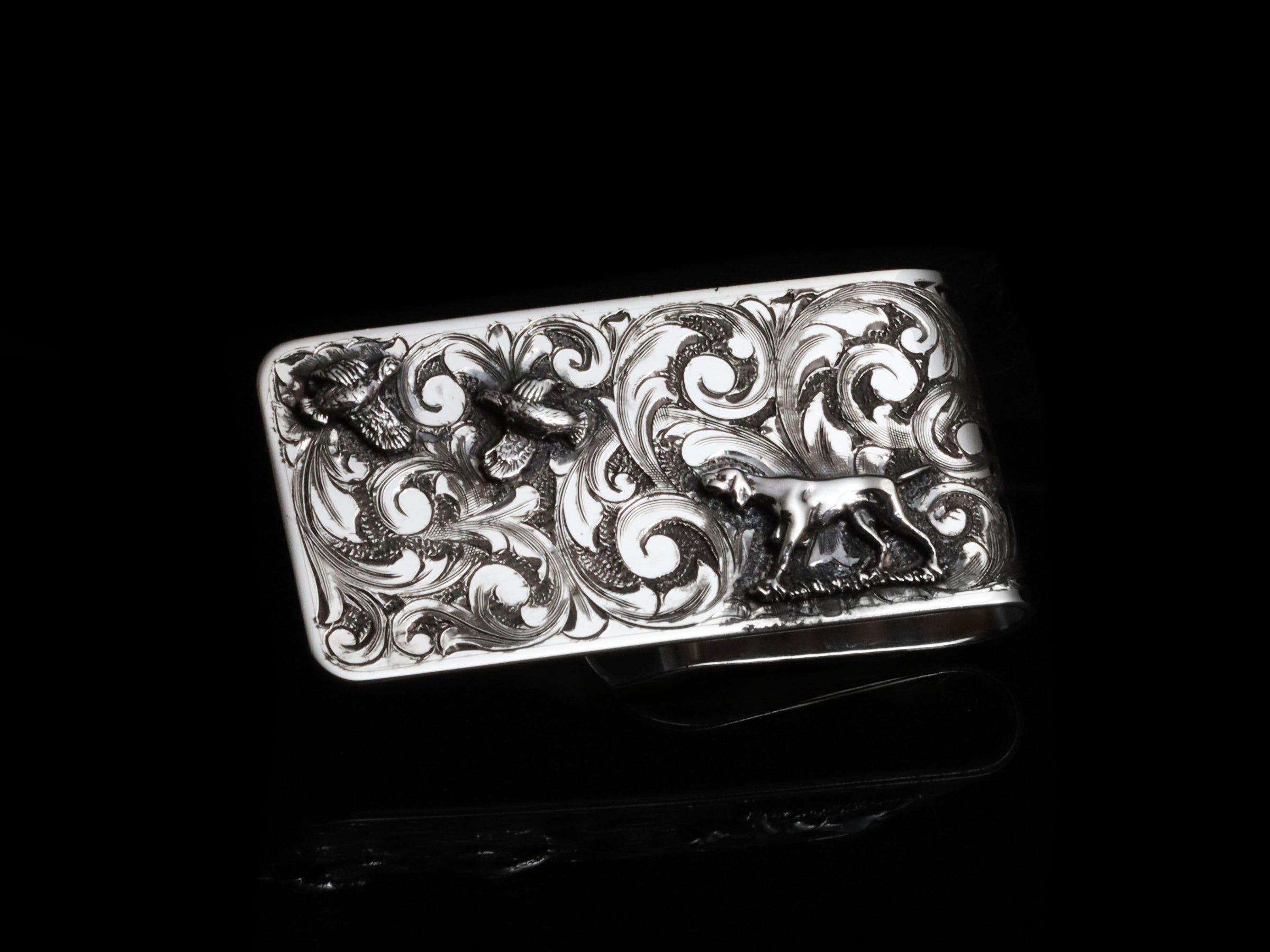 The Quail Hunt Austin Style Money Clip by Comstock Heritage is a Sterling silver piece featuring a fluid, sprawling design. Hand engraved with careful detail, it offers a relaxed yet intricate look that feels effortless. Among the swirls of the deep, Austin style engraving, is a quail hunt scene. A Sterling silver hunting dog is pointing at two matching silver flying quail in the sky.