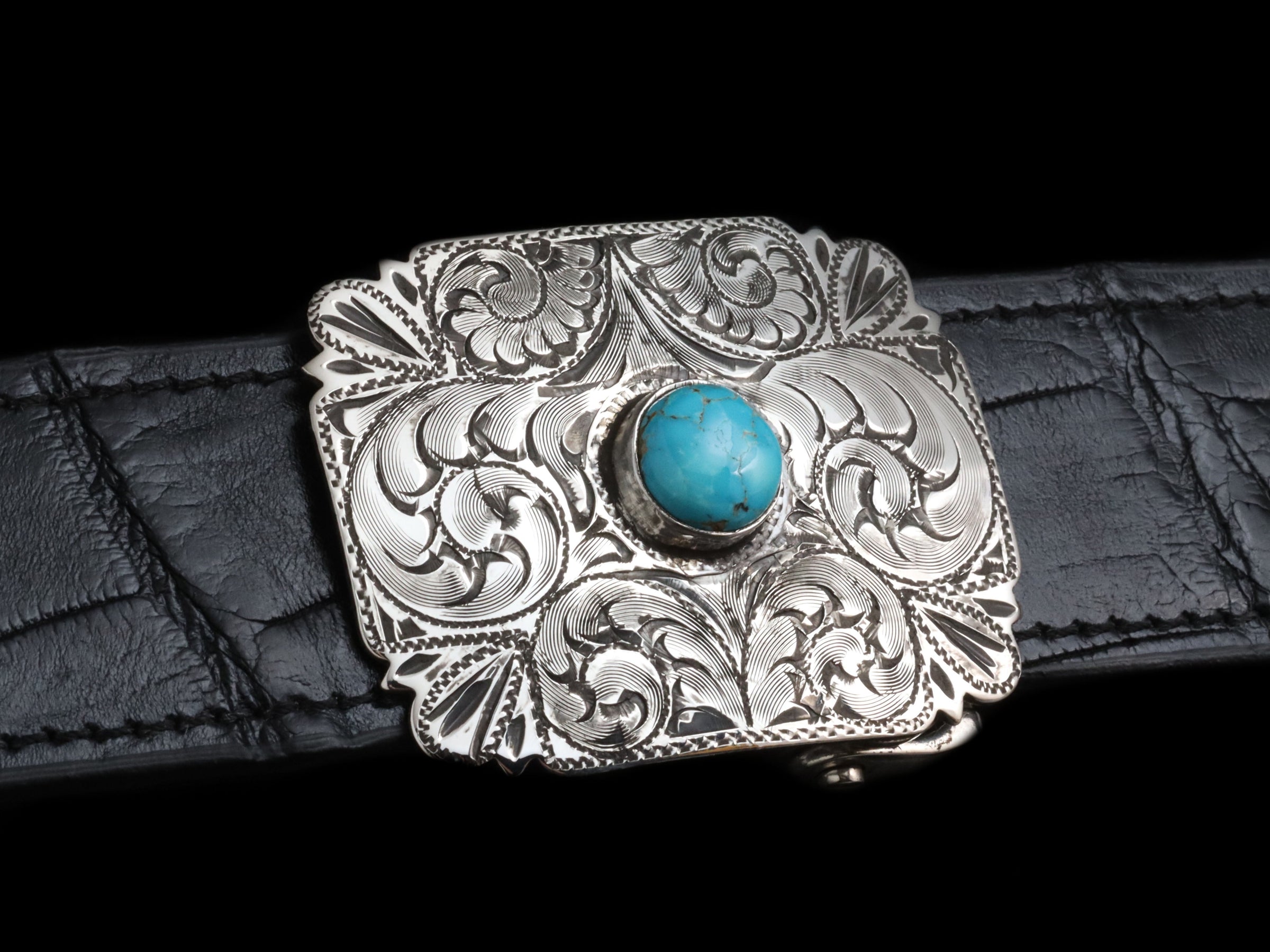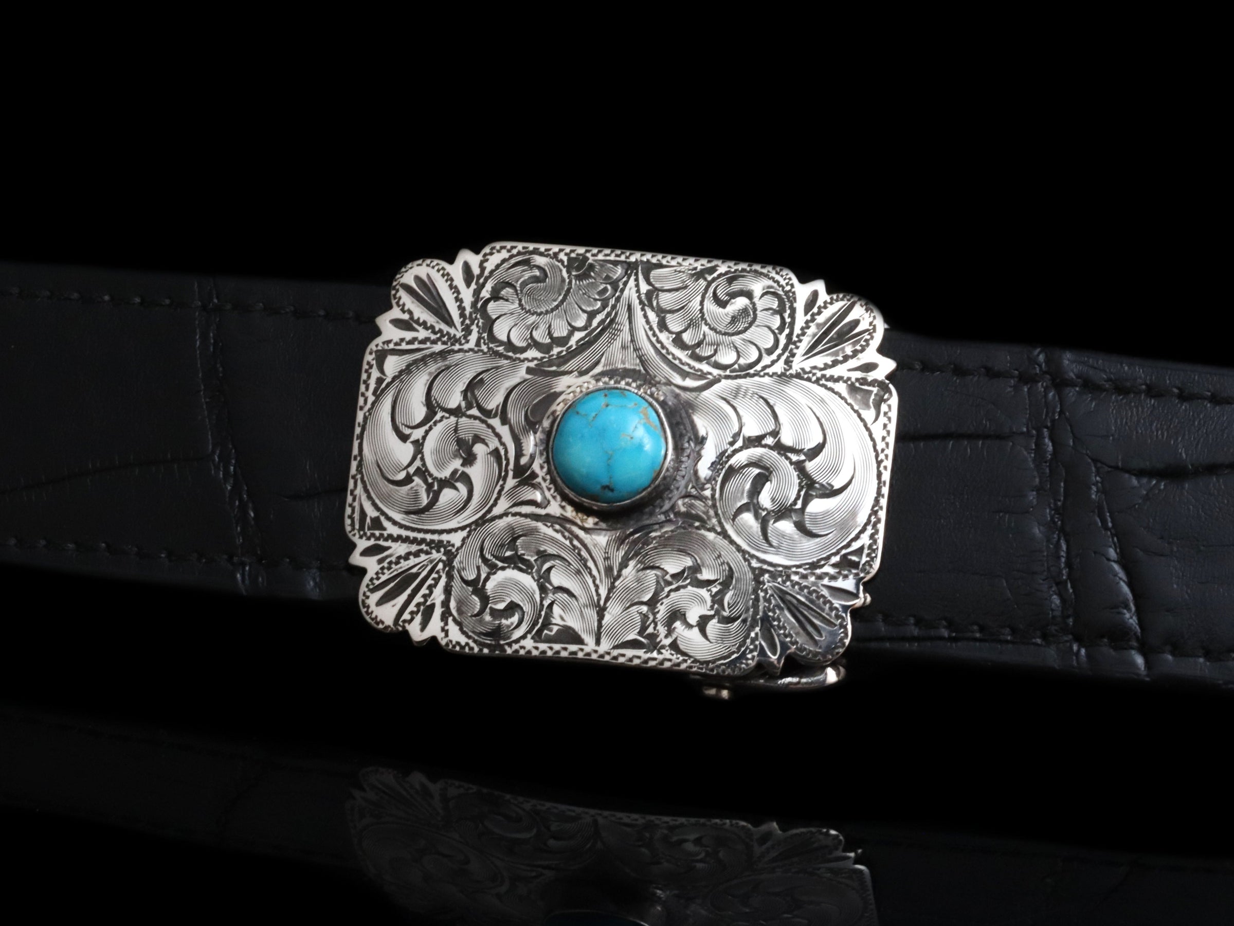 The Pecos Turquoise by Comstock Heritage is a smaller “Pecos” shape point-and-scallop belt buckle crafted entirely from Sterling silver. At the center, a bright blue piece of American turquoise sits atop traditional Western scroll engraving, bringing classic character to this compact design.
